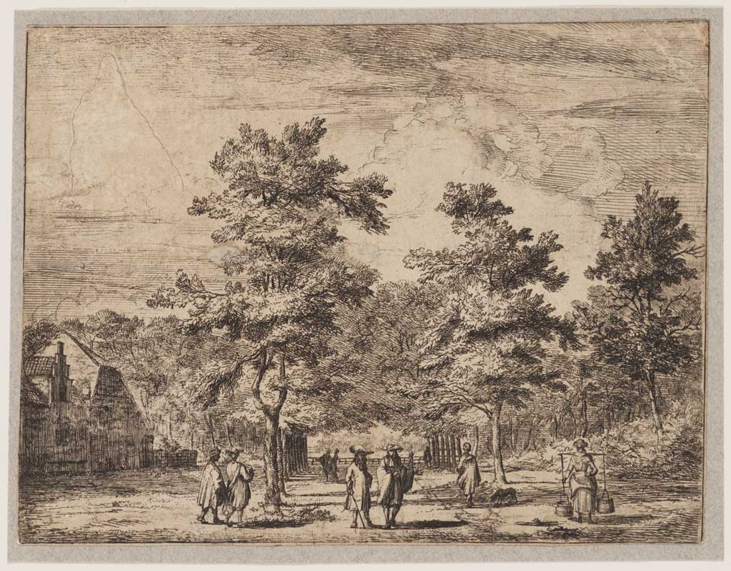 Laan met bomen en wandelaars, rechts een vrouw met j...