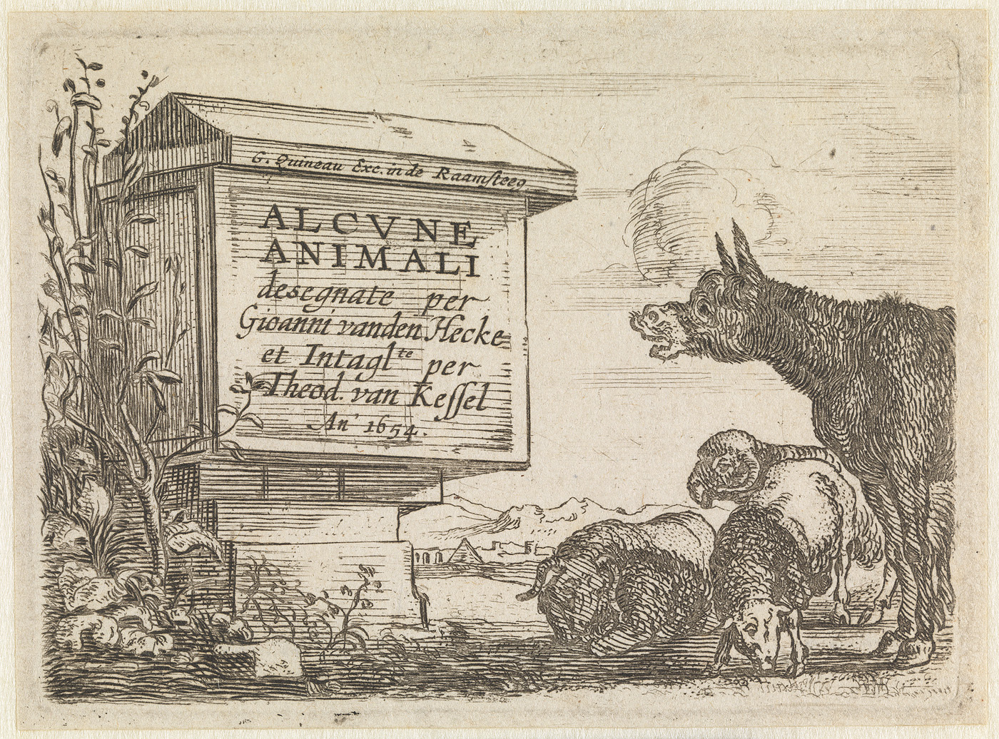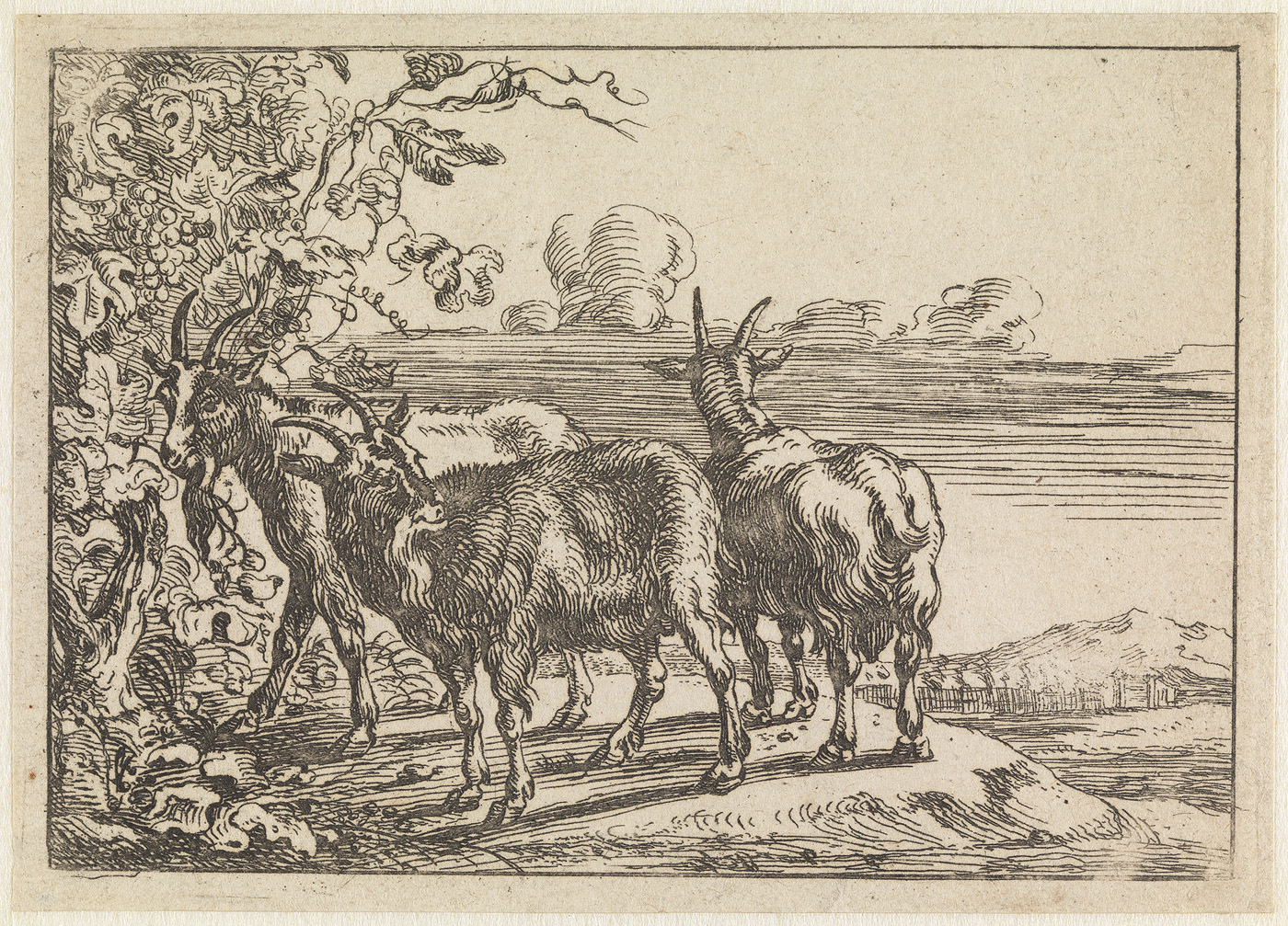Landschap met drie geiten (prent uit de serie: alcun...