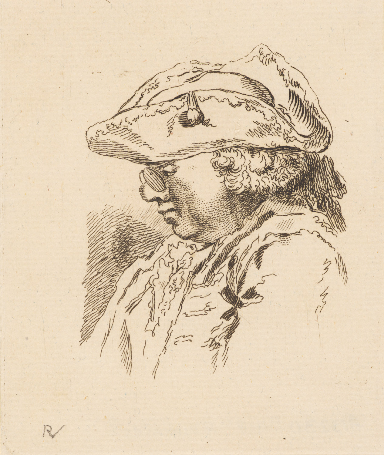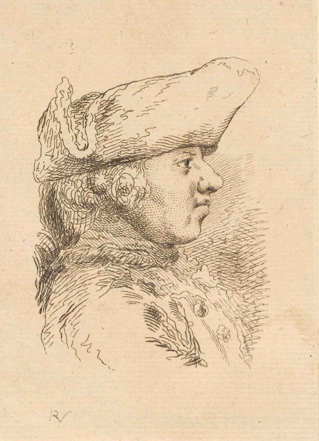 Hoofd van een man en profil naar rechts met steek op...