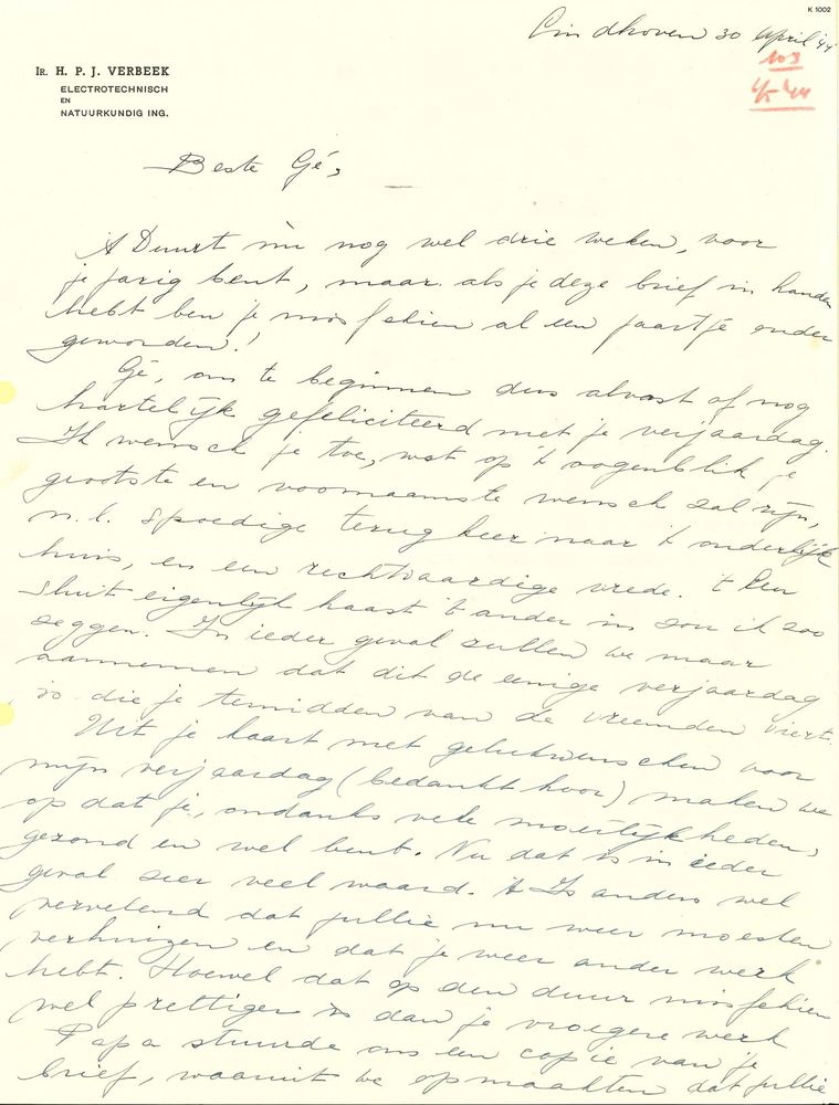 Brief van Miep in Eindhoven aan Gé Verbeek in Watens...
