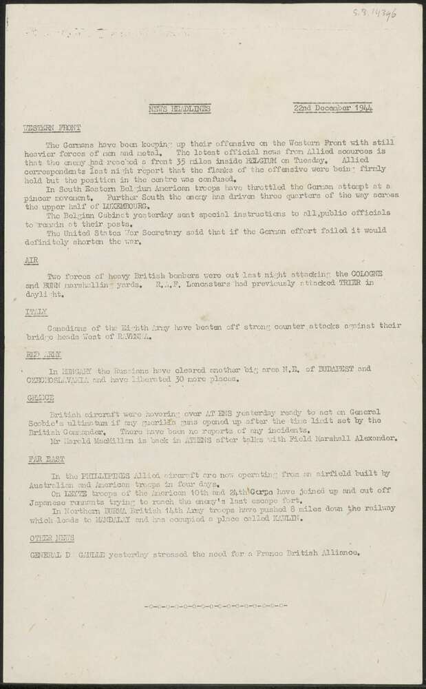News headlines, 22nd December 1944