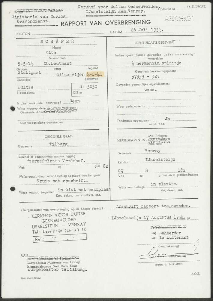 Overbrengingsrapport naar Ysselsteyn van Otto Schäfe...
