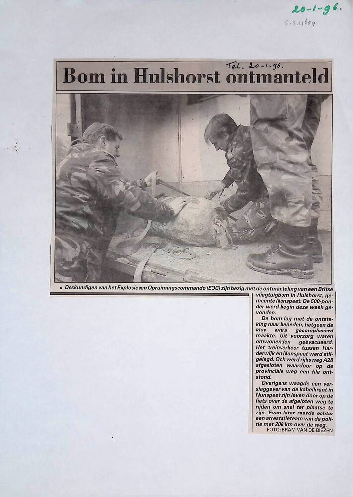 Knipsel, 20-1-1996. Bom in Hulshorst ontmanteld.