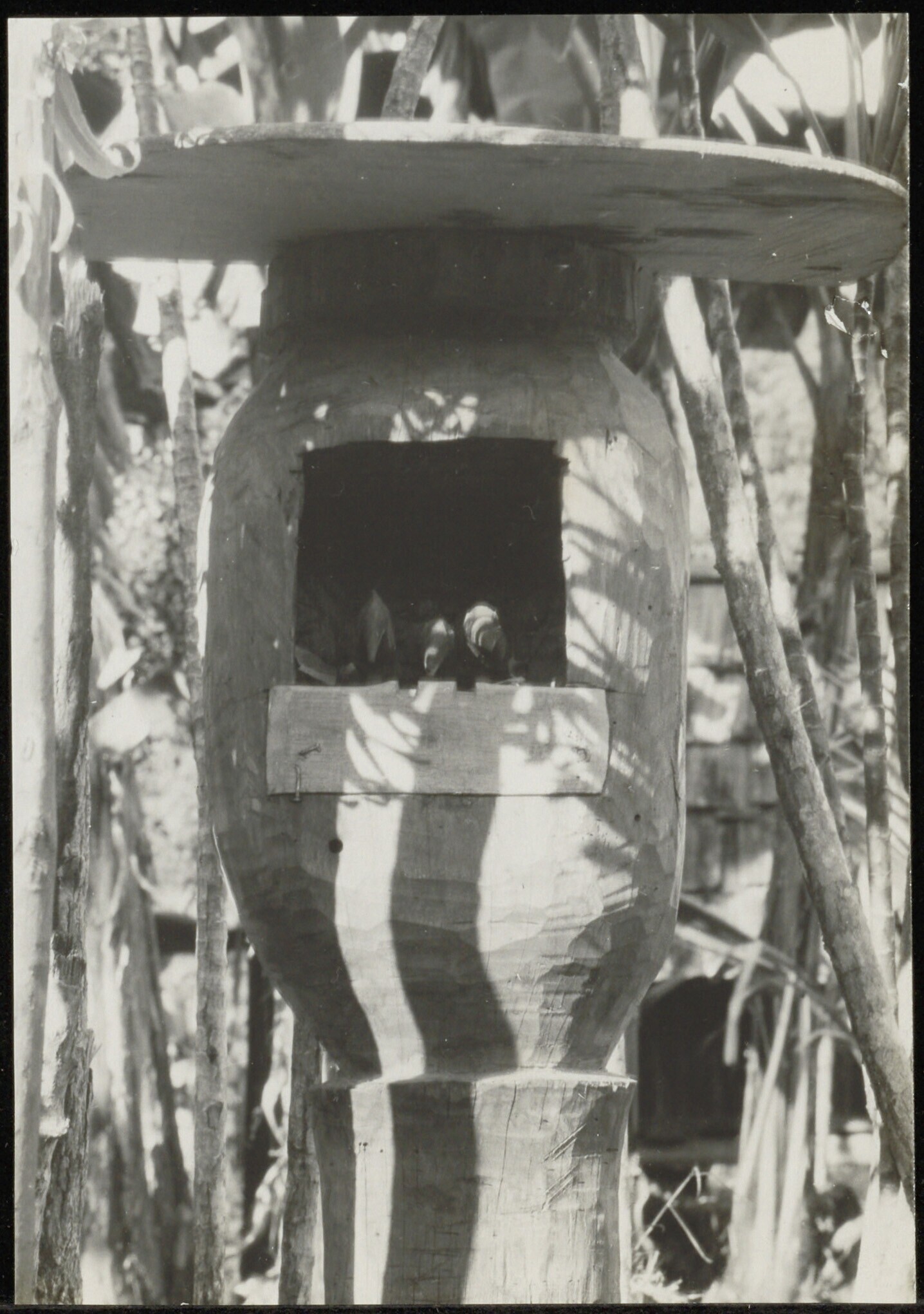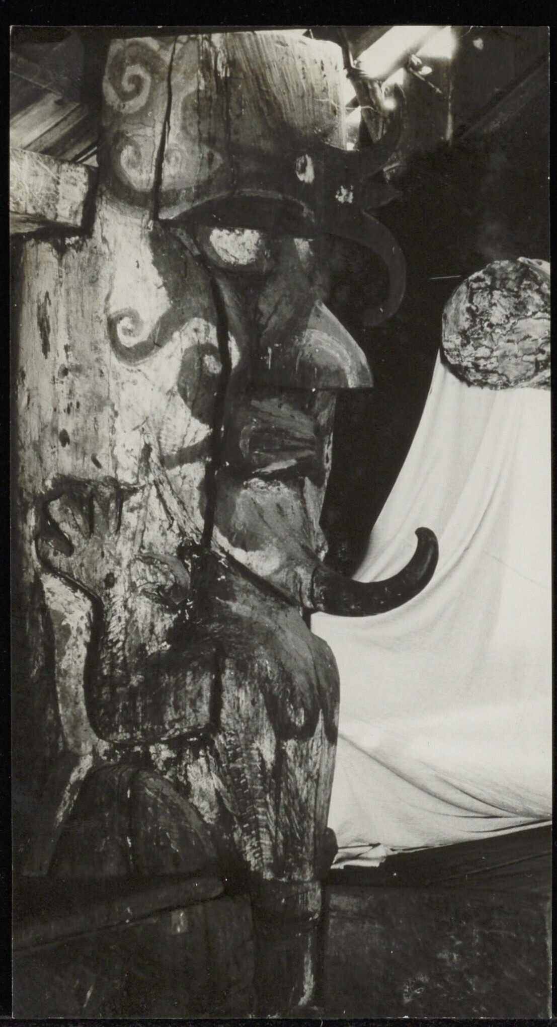 Rituele paal waaraan menselijke figuren zijn bevestigd