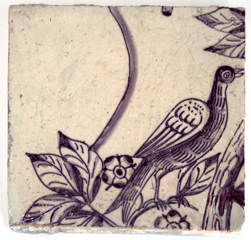 Dieren tegel. Vogel op een tak, mangaan. Deel tegelt...