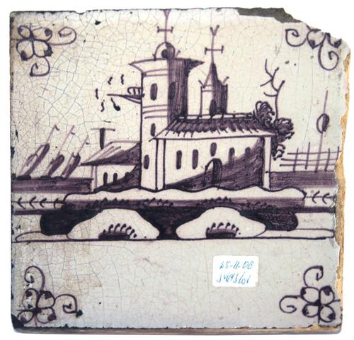 Landschap tegel. Huizen met wachttoren en kerk langs...