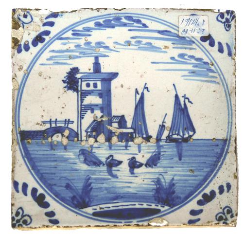 Landschap tegel. Stenenbaken met vlag
