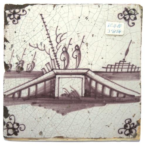 Landschap tegel. Twee figuren, vissers op een brug.