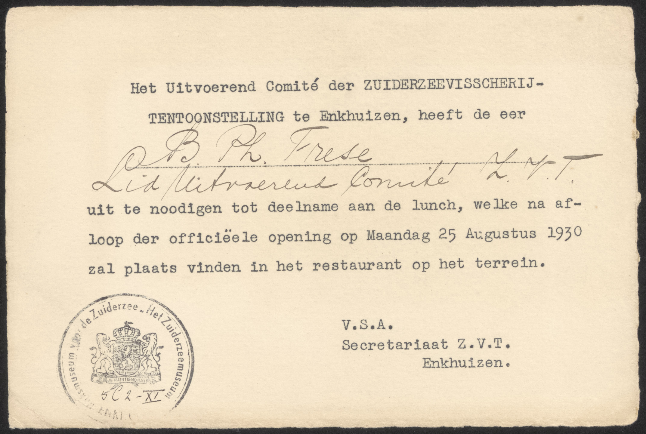 Uitnodiging voor de Heer B. Ph. Frese voor de lunch