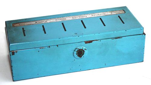 Geldkist. Metalen, zilverkleur beschilderde kist.