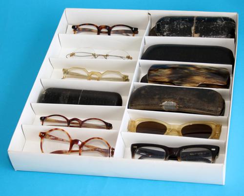 Drie dozen met twaalf compartimenten voor brillen.