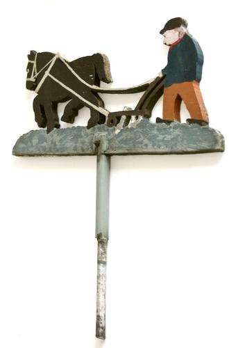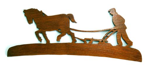 Gezaagde voorstelling boer met paard en eg