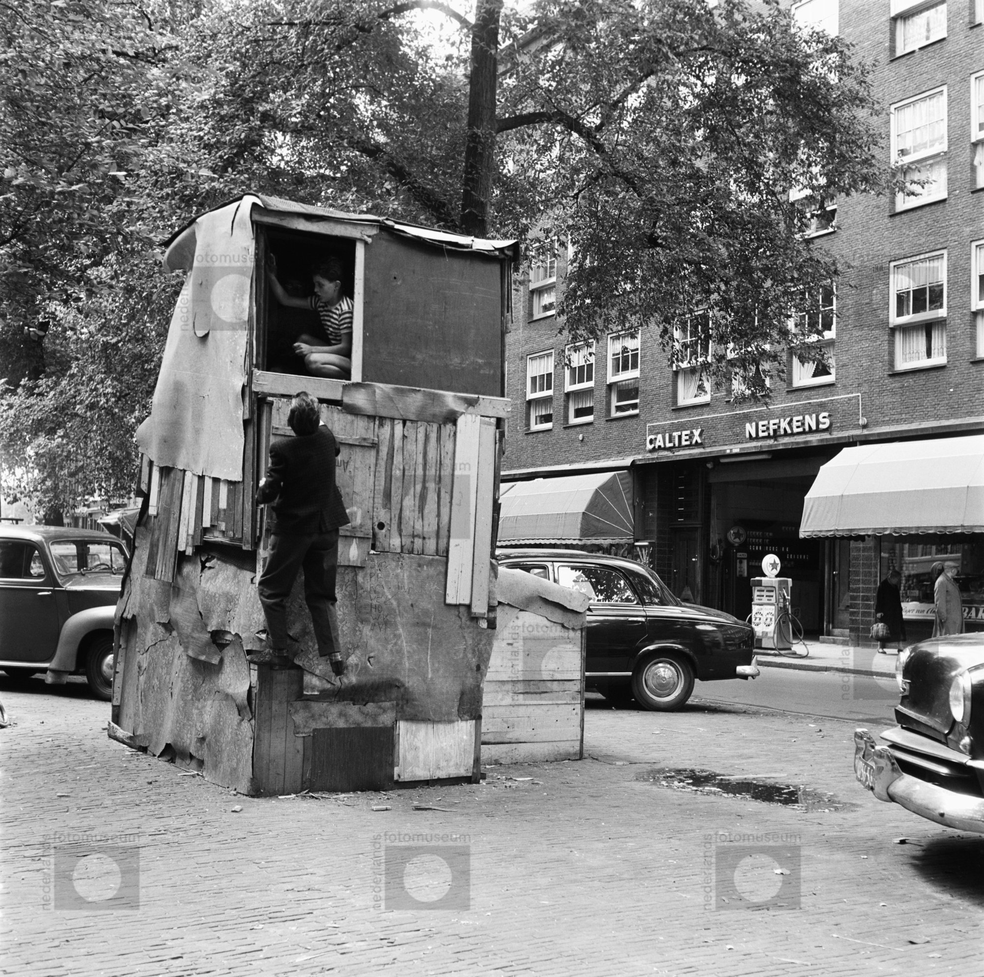 Amsterdam, Elandsgracht. Kinderen bouwen hut op straat.