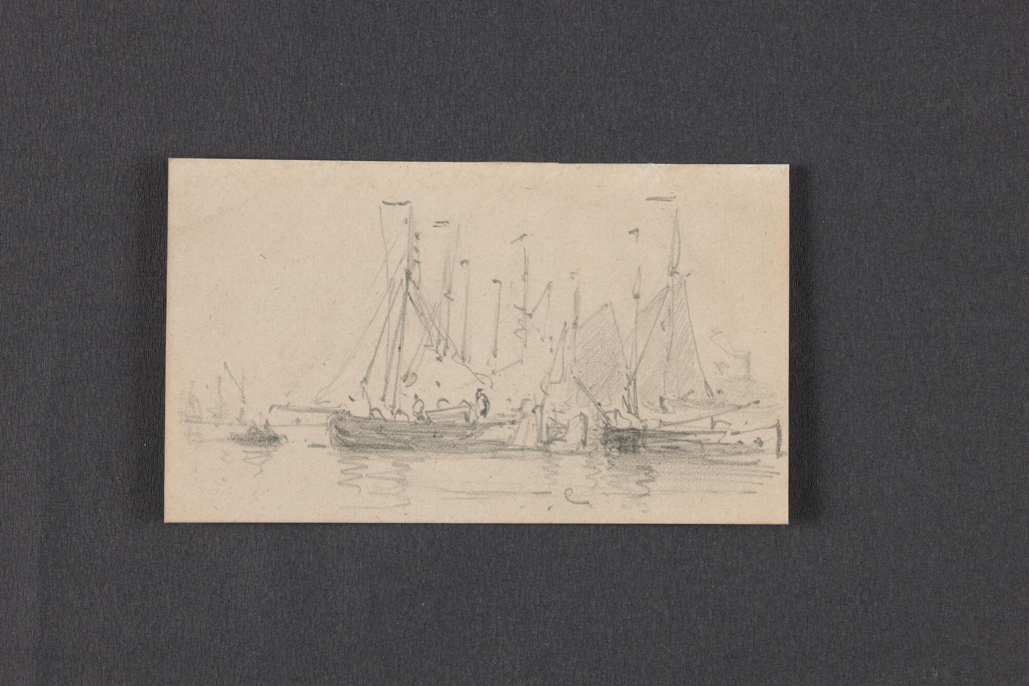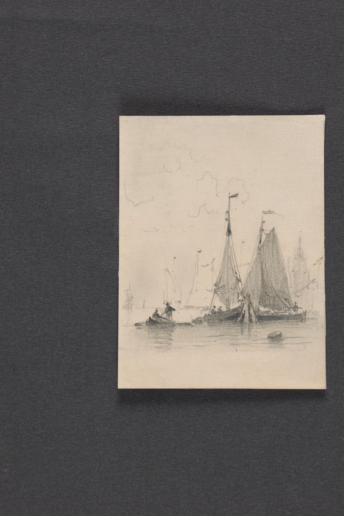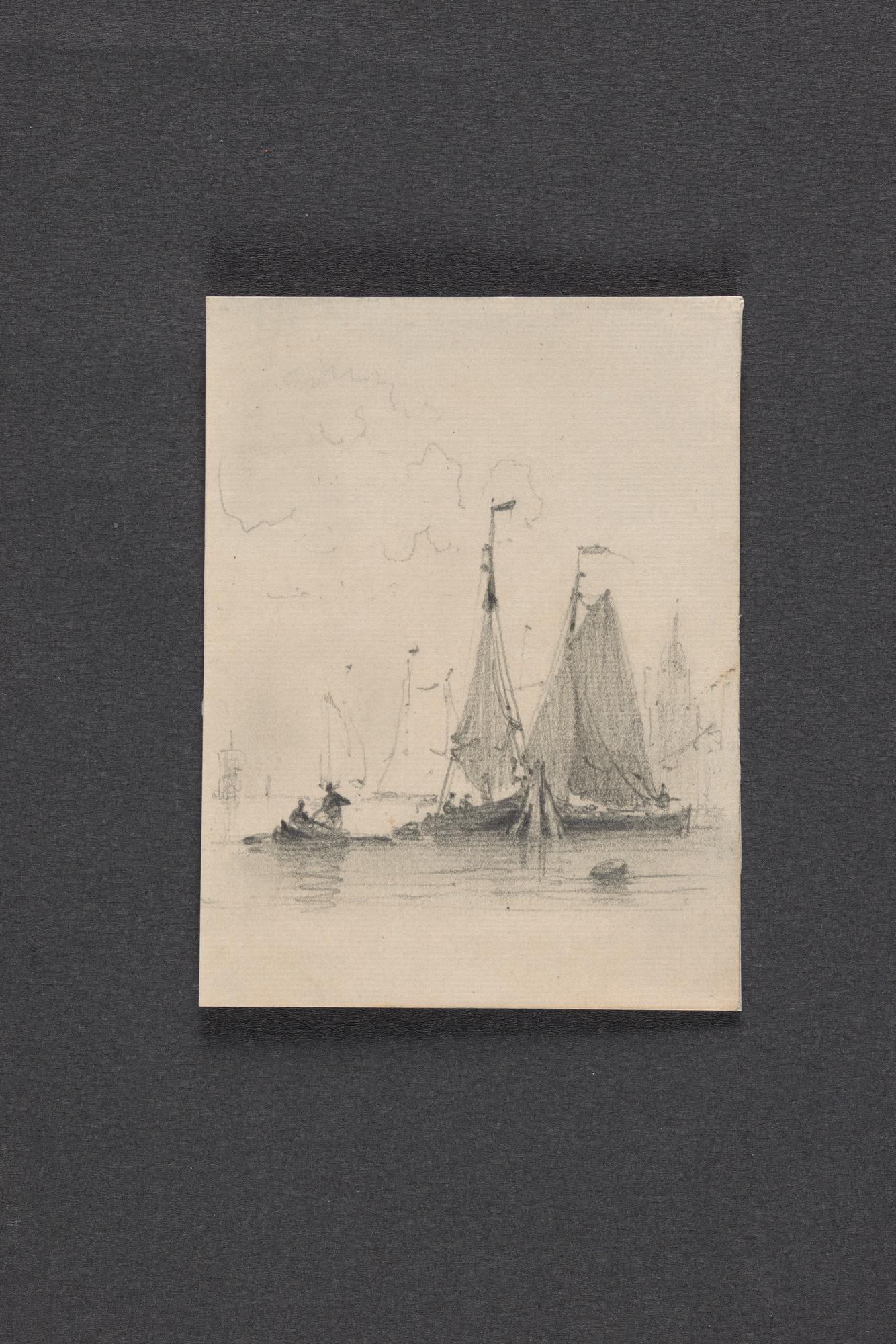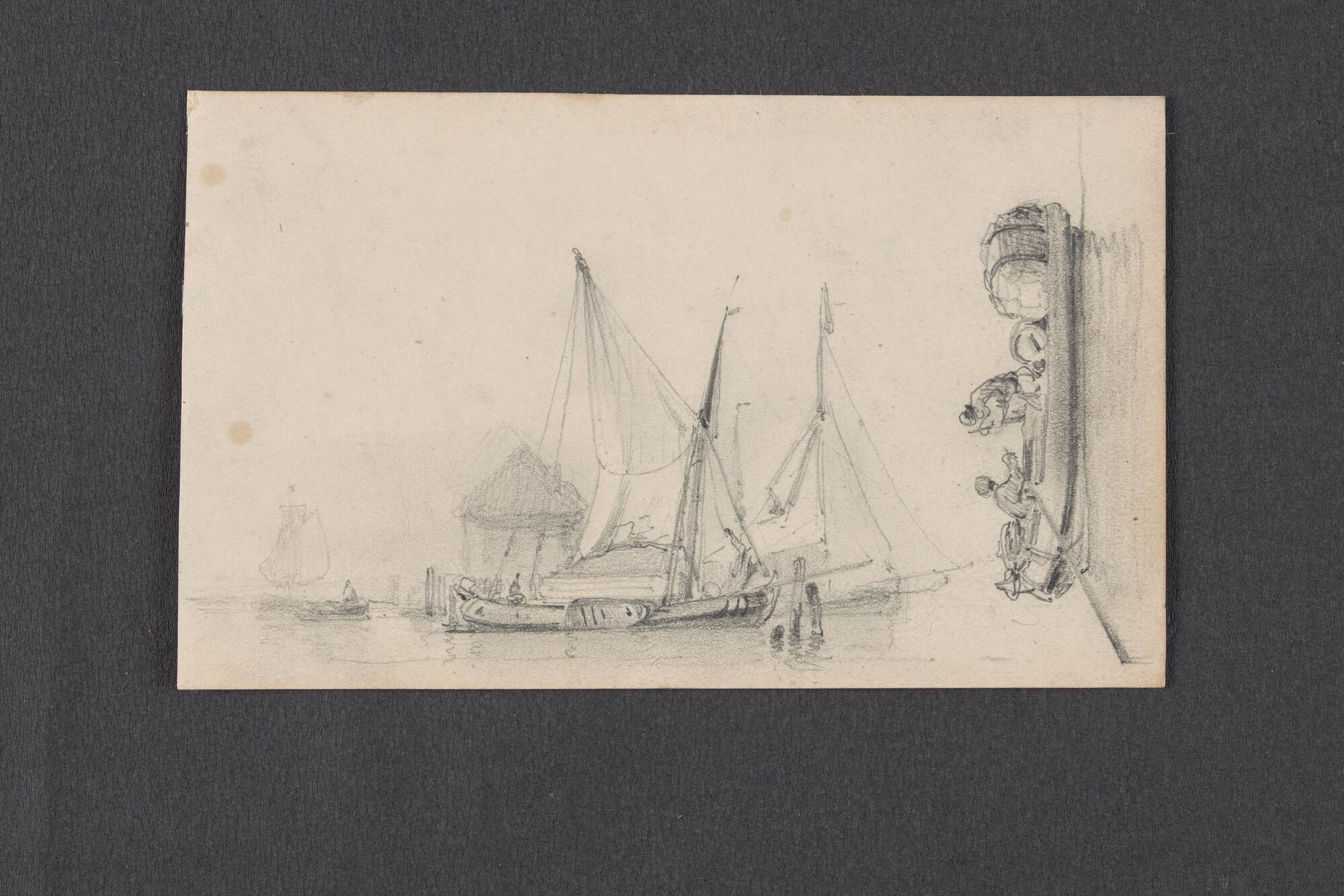 Schetsen van vismanden, zeilende botter en havenuitgang