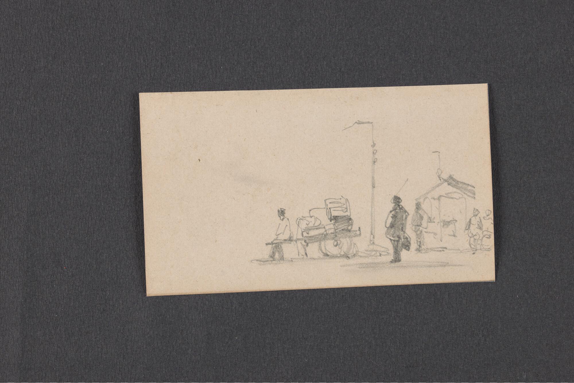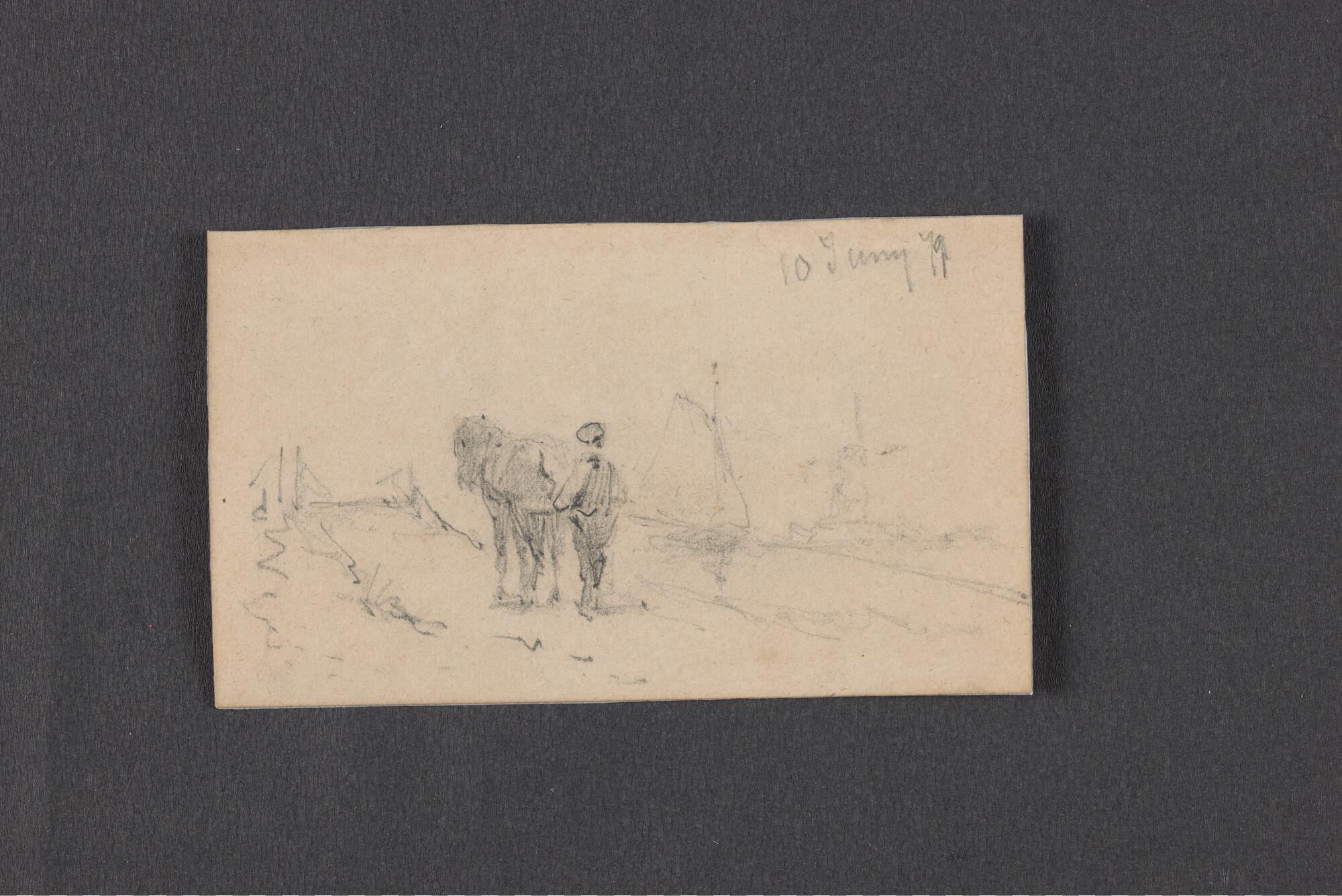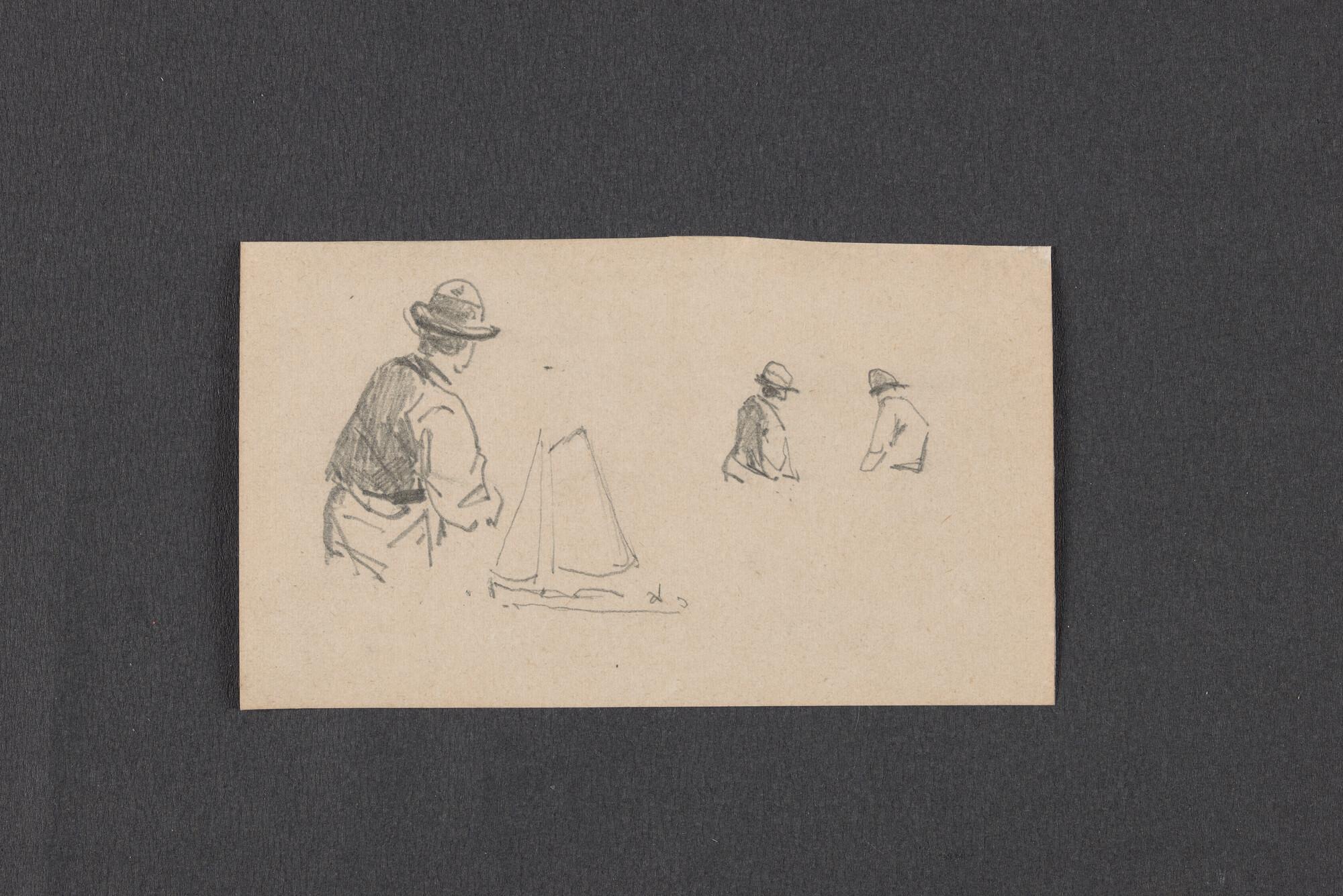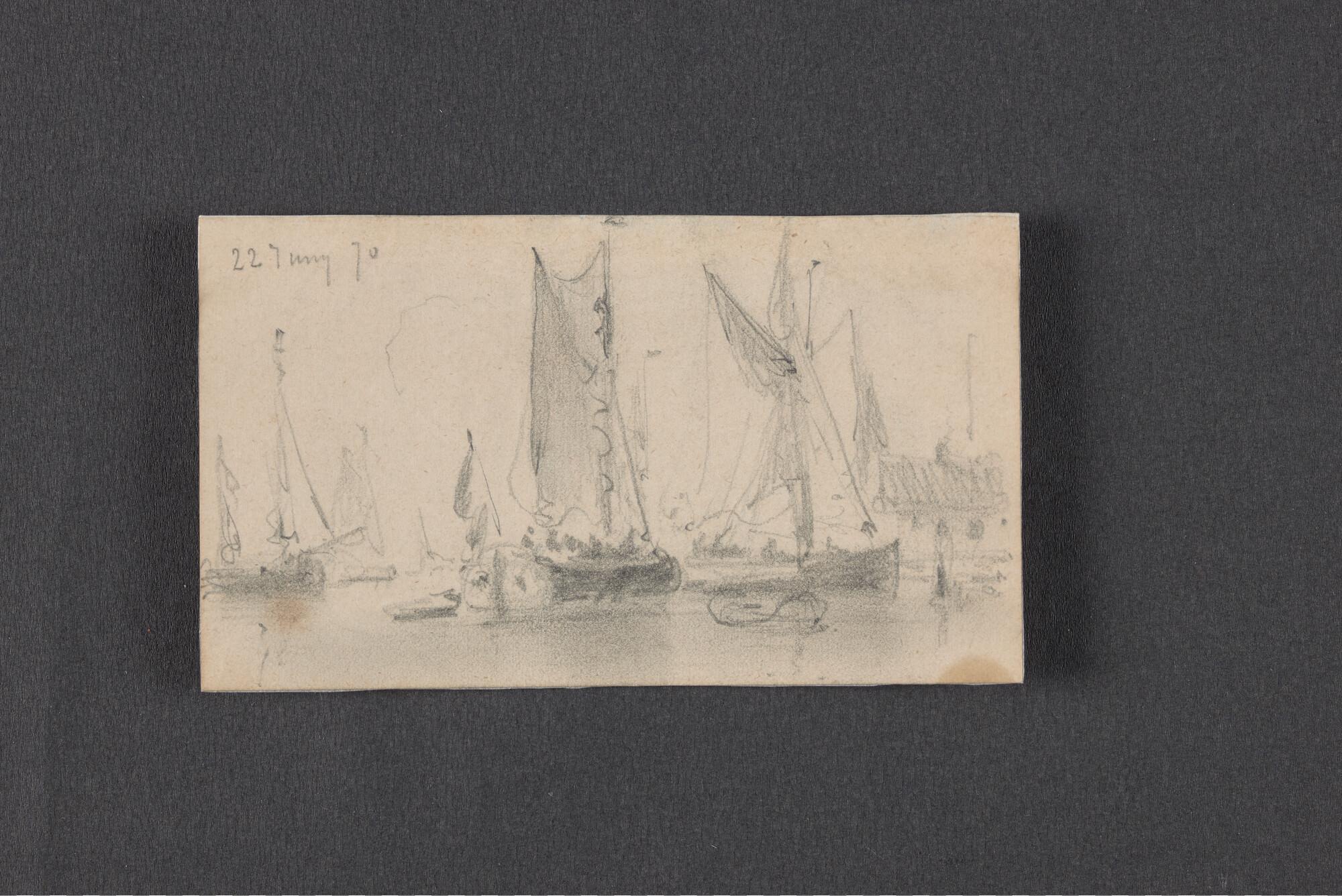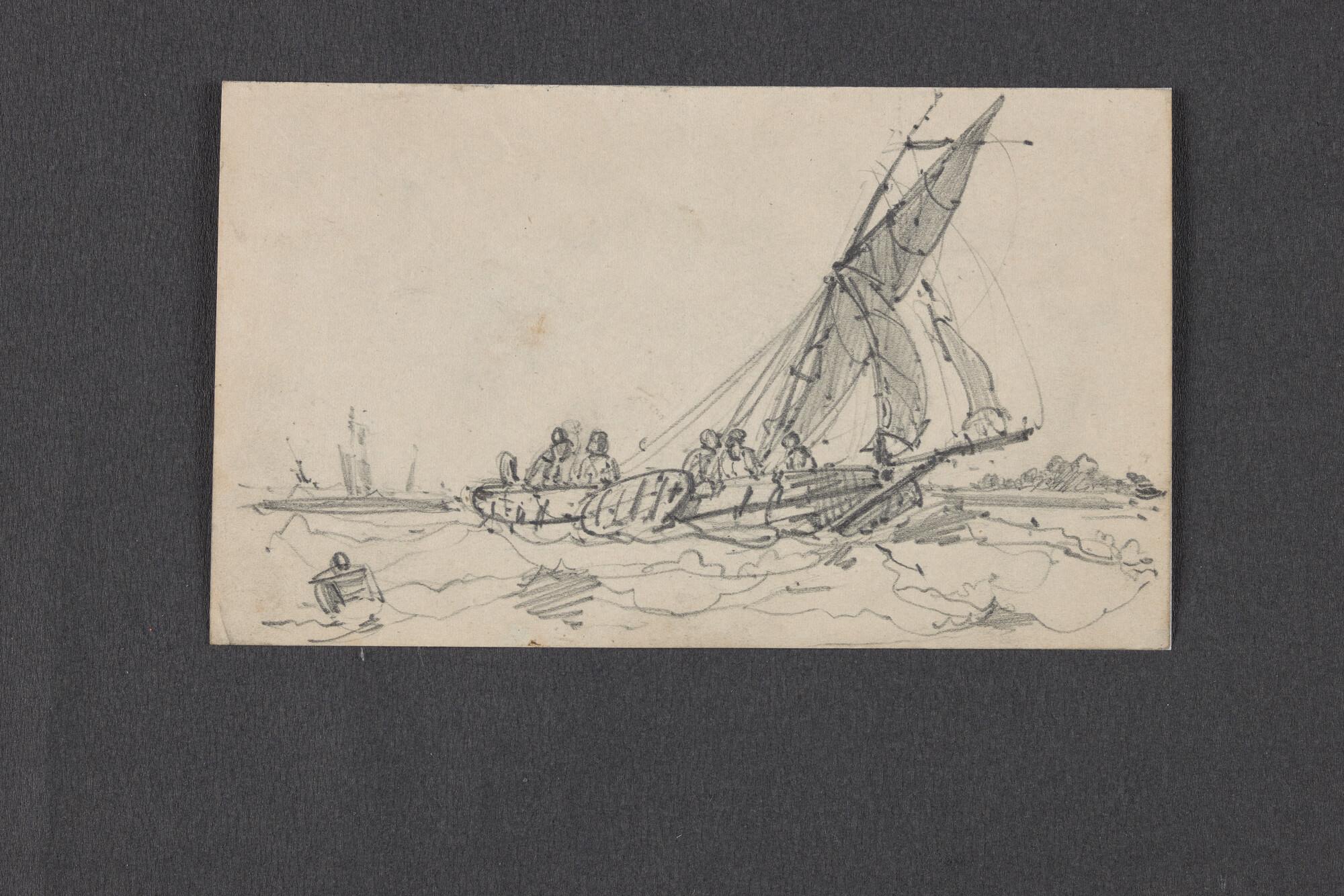 Schetsen van vismanden, zeilende botter en havenuitgang