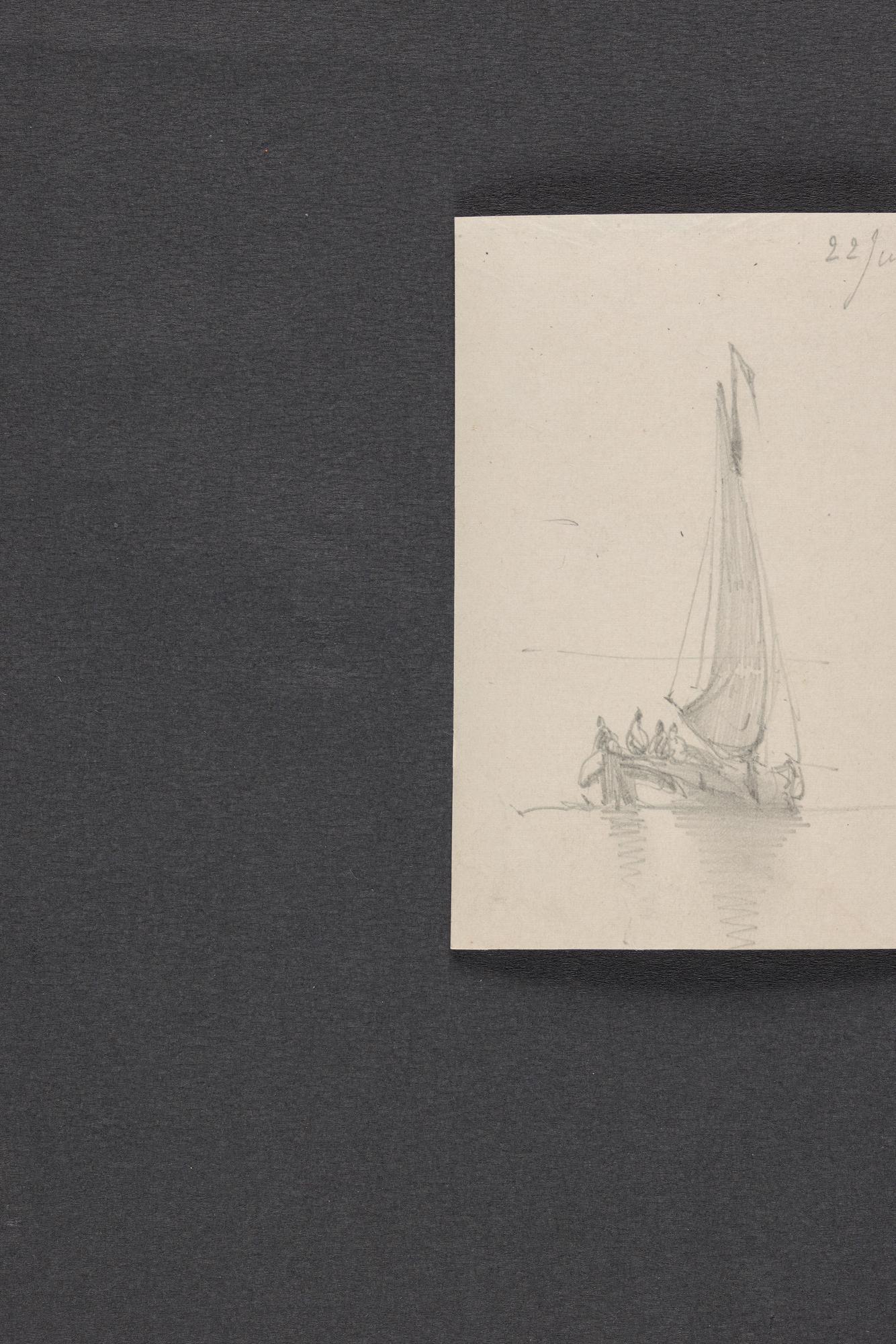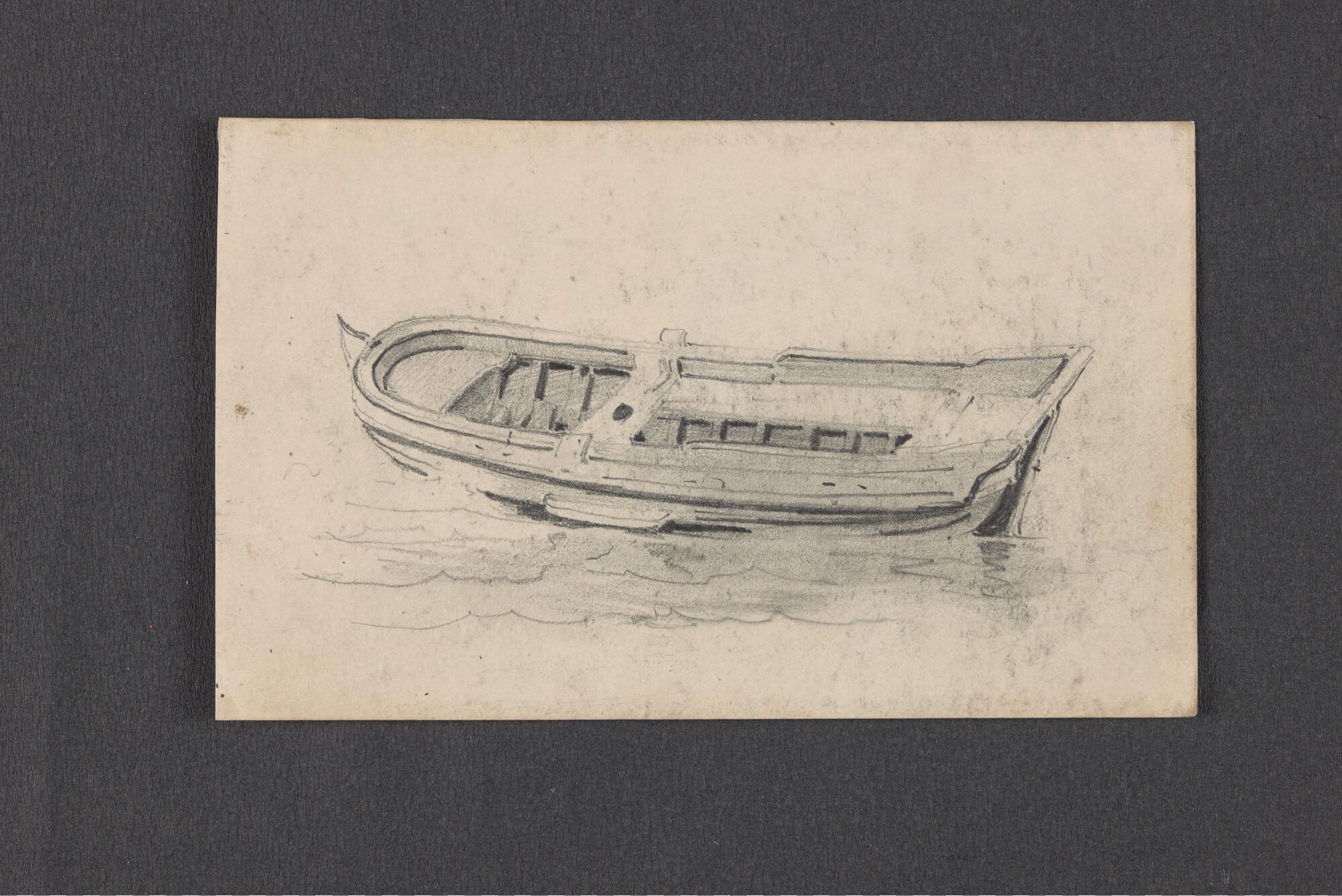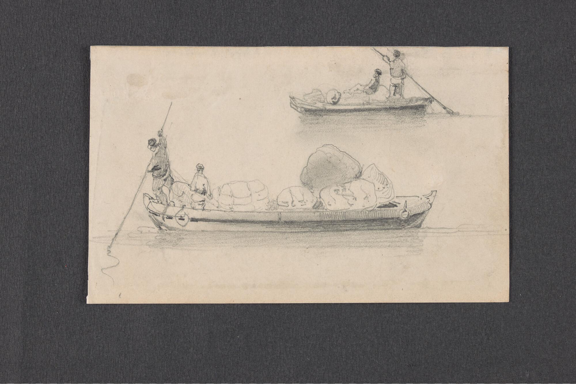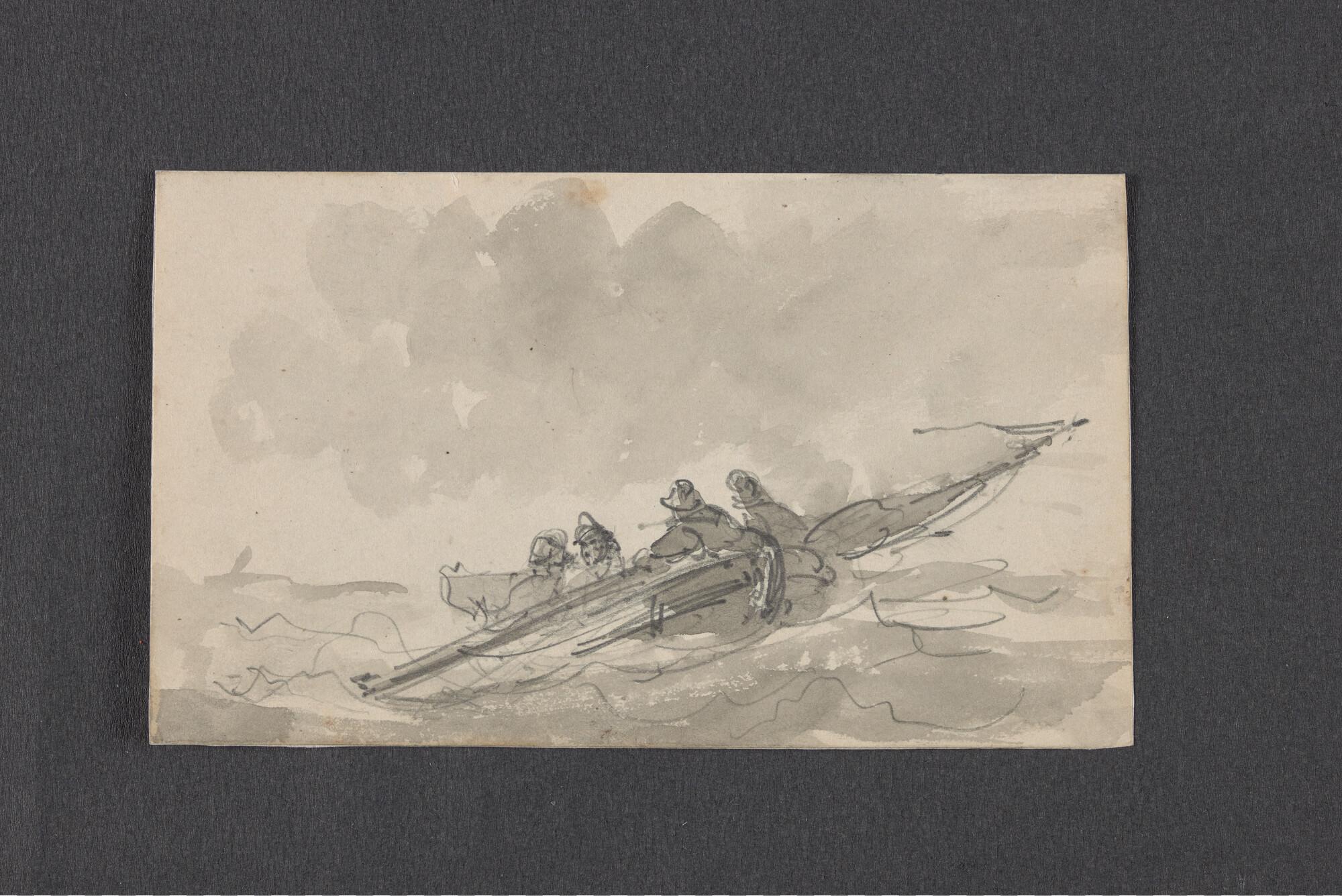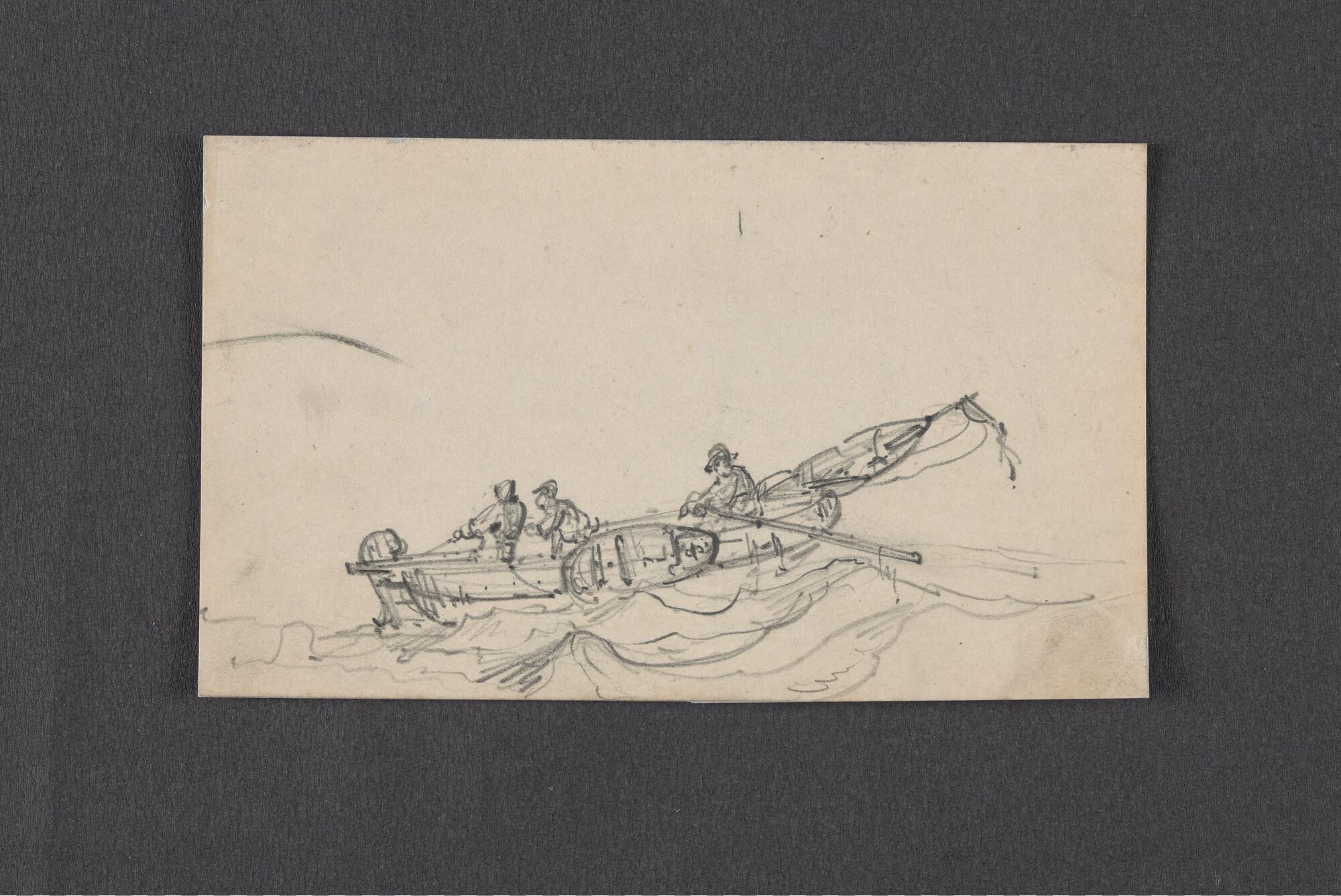 Schuitje met roeier en drie passagiers en schets van...