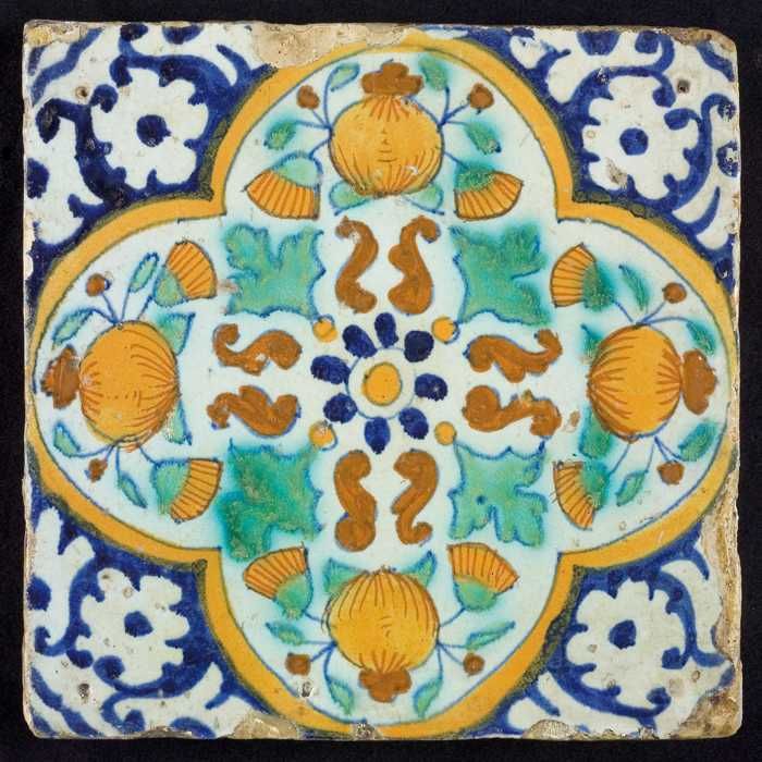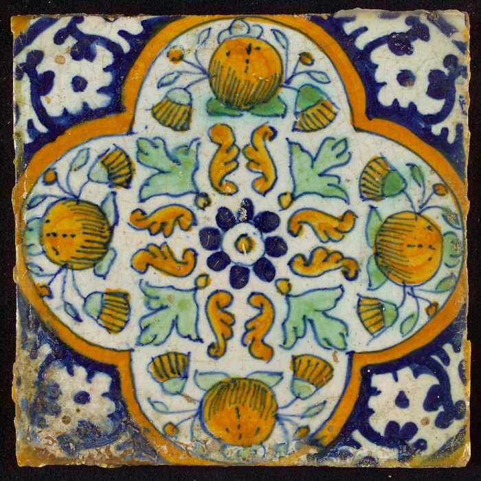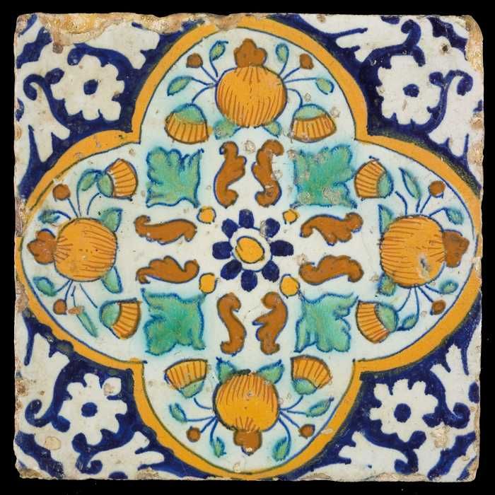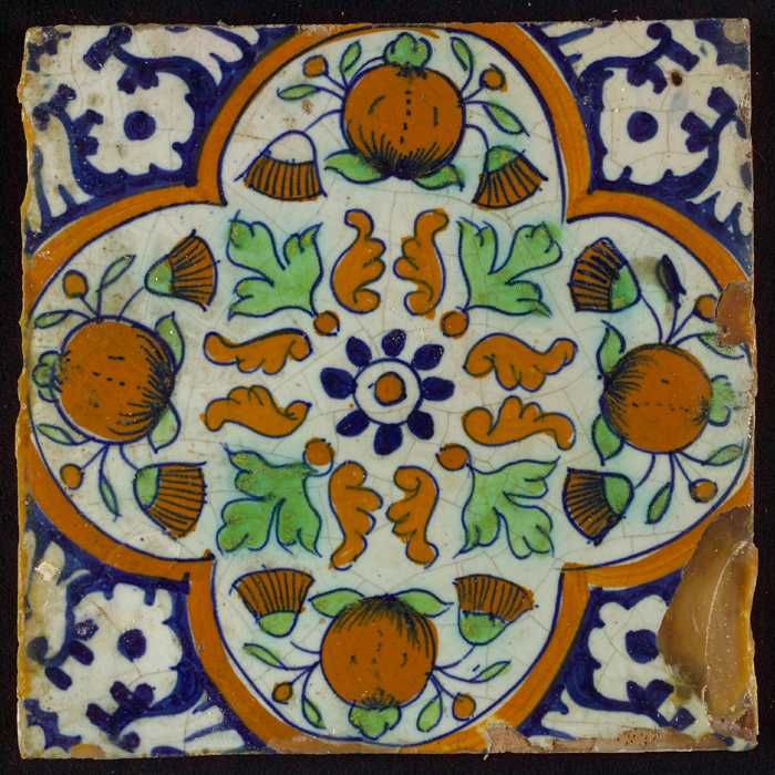 Ornamenttegel, rozet waarboven oranjeappels en gouds...