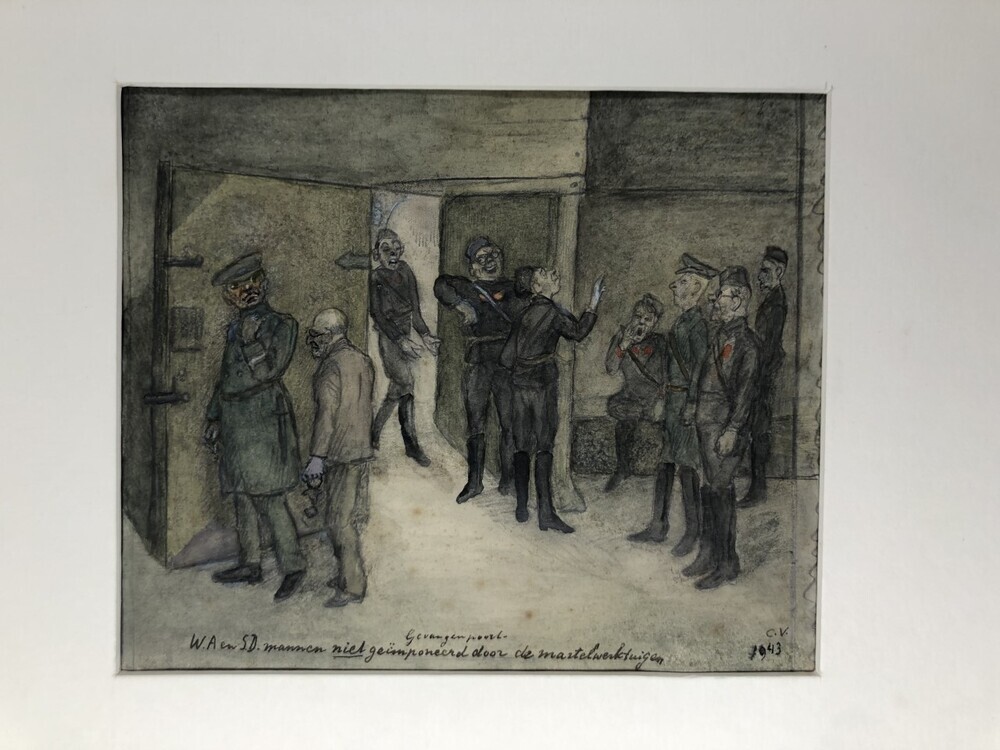 Aquareltekening van S.D. en W.A.-mannen in de Gevang...