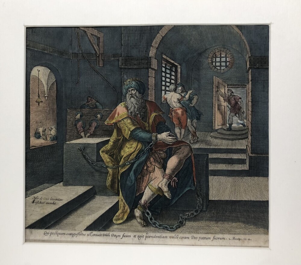 Bijbelprent Koning Manasse vastgeketend.(II Kron.33 ...