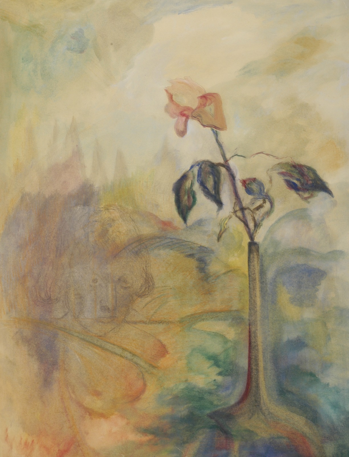 Vaag portret met roos in vaas (in landschap)