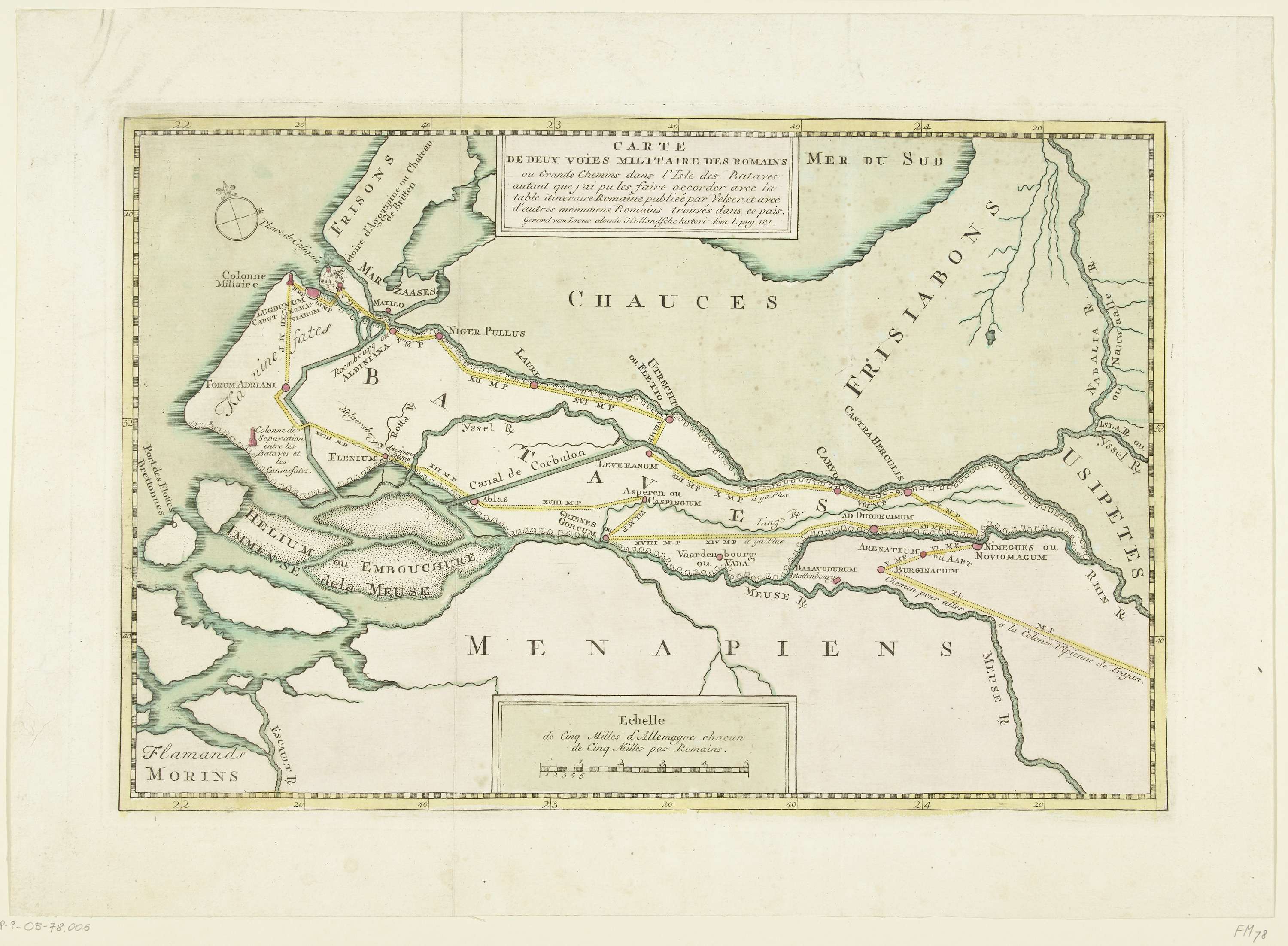 Kaart van twee Romeinse militaire wegen in Nederland