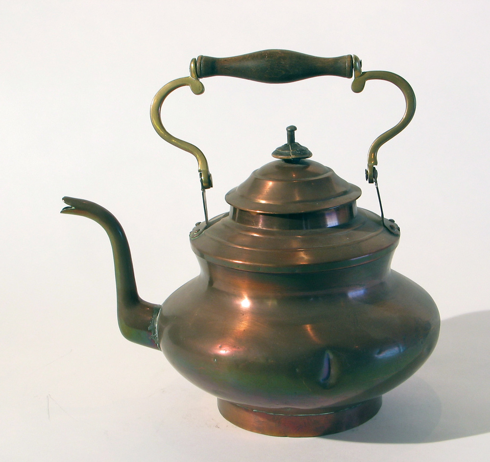 Ketel van rood en geel koper en houten handgreep, 19...