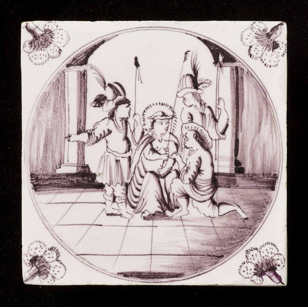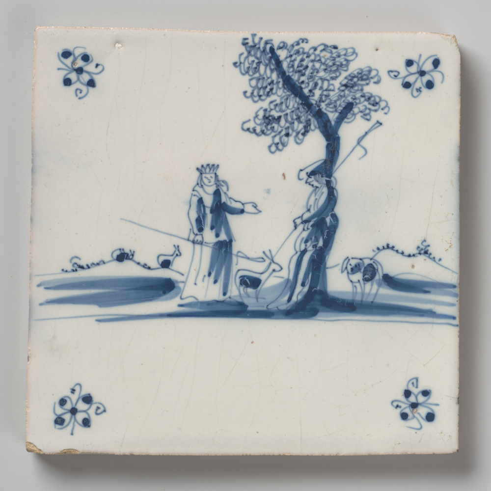 Tegel van keramiek met tinglazuur, voorstellende: De...