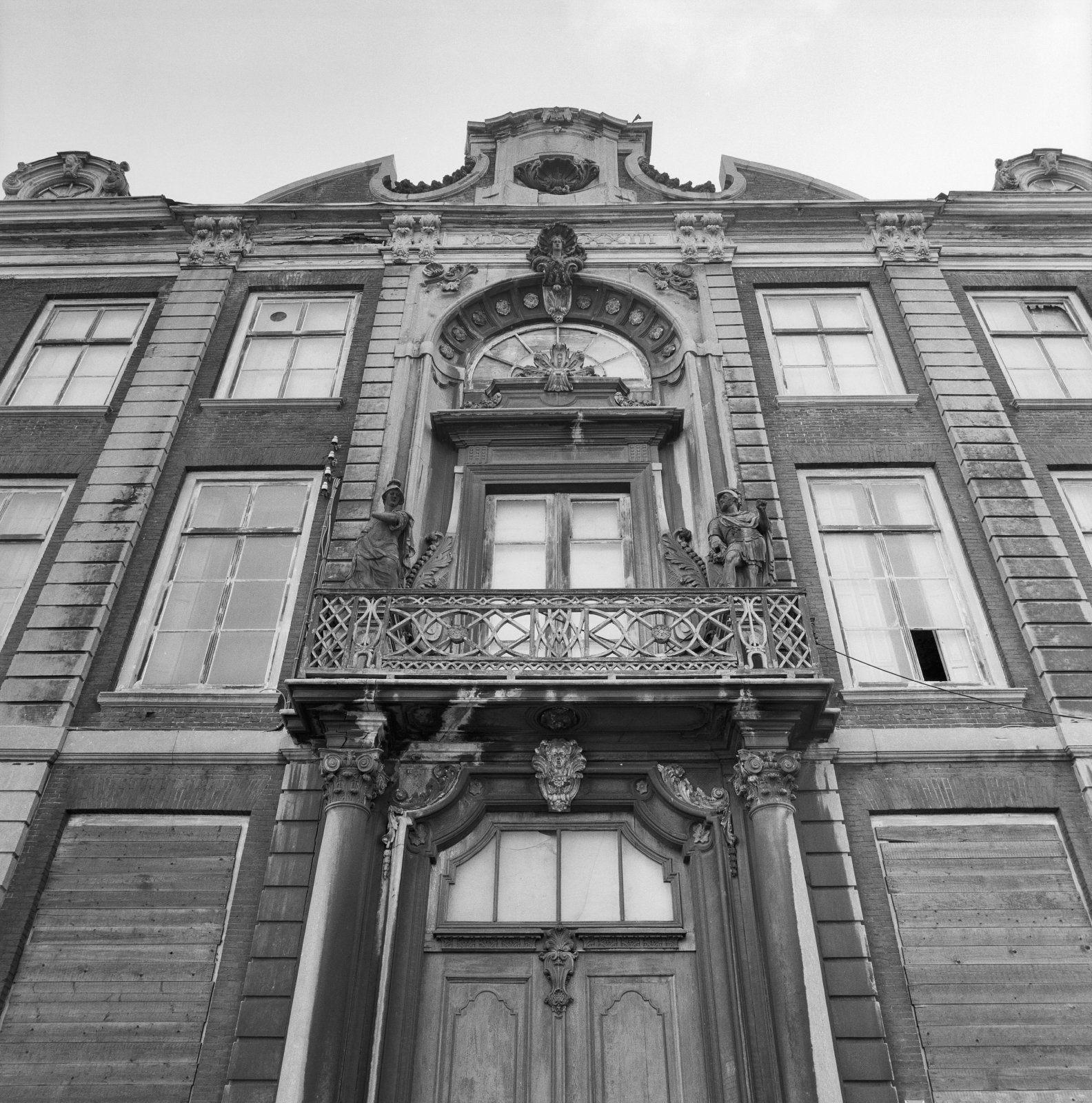 Voorgevel, middenpartij met balkon, boven de ingangs...