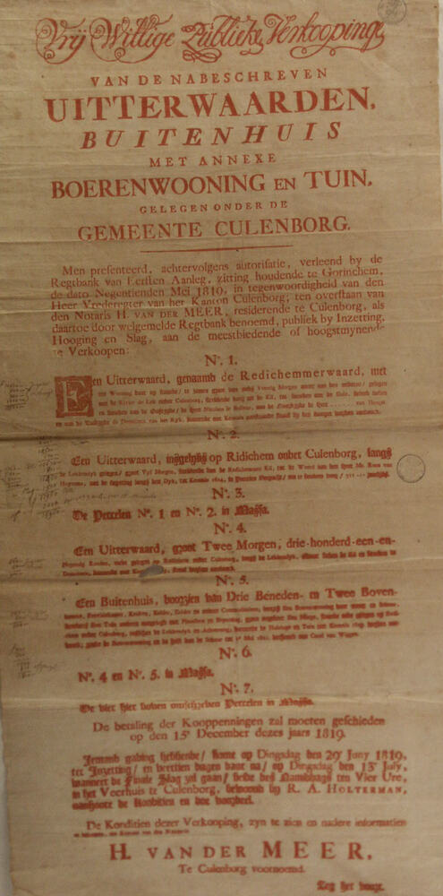 Affiche voor de verkoping van uiterwaarden etc. onde...