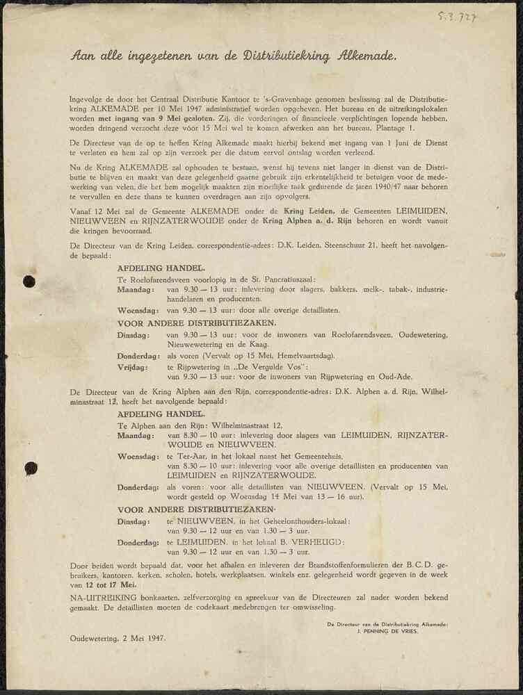Poster Mededeelingen Distributiekring Alkemade, 20 m...