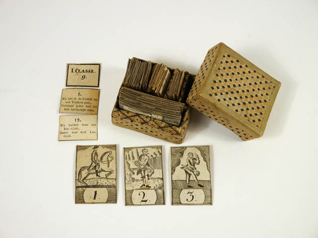 Kist met toverlantaarnplaten en catalogi.