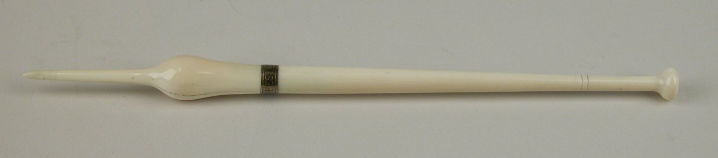 Ivoren paaskaarsstift met zilveren bandje waarop "+ ...