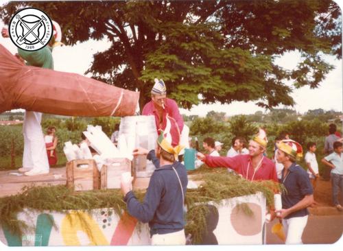 Raad van Elf deelt sap uit tijdens de carnavalsoptocht