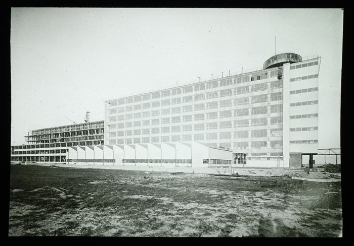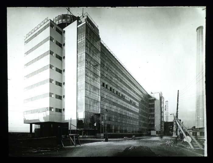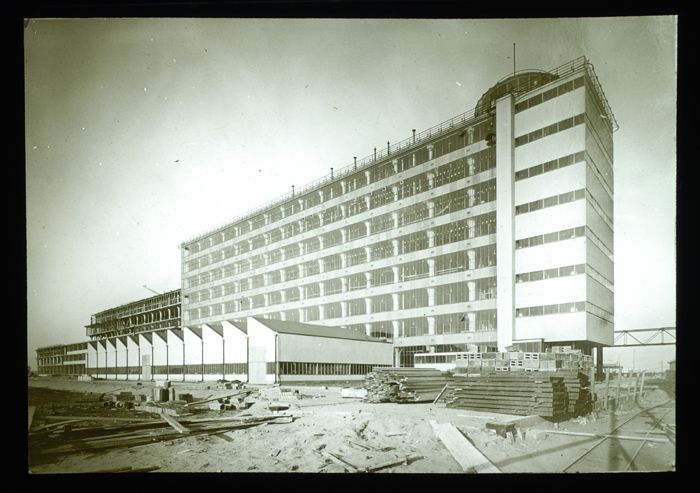 Glasplaatnegatief van de bouw van de fabriek van Van...