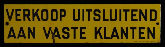 Geel emaille bord met in zwarte letters "VERKOOP UIT...