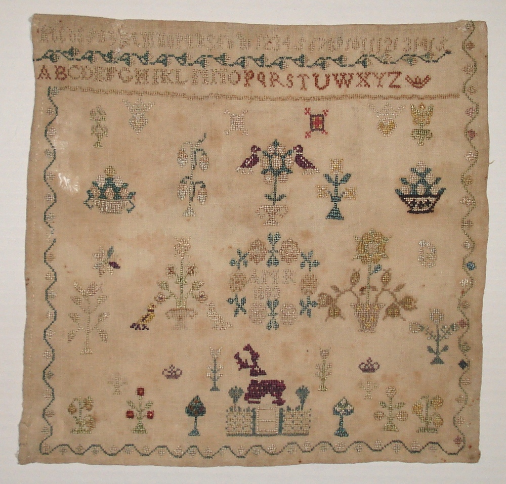 merklap van linnen en zijde met letters, cijfers, mo...