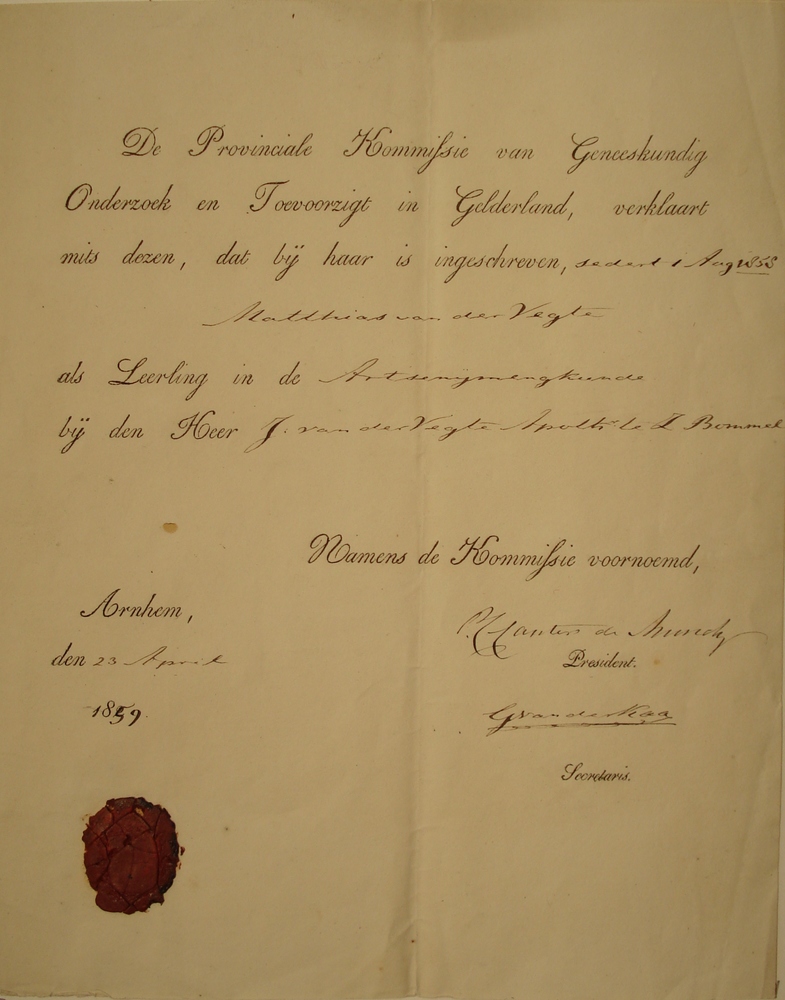 Getuigschrift Geld.Mij. van Landbouw voor F.W. de Vi...