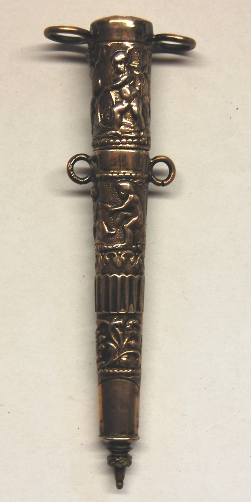 naaldenkoker. Zilveren koker met dop. Op koper vier ...