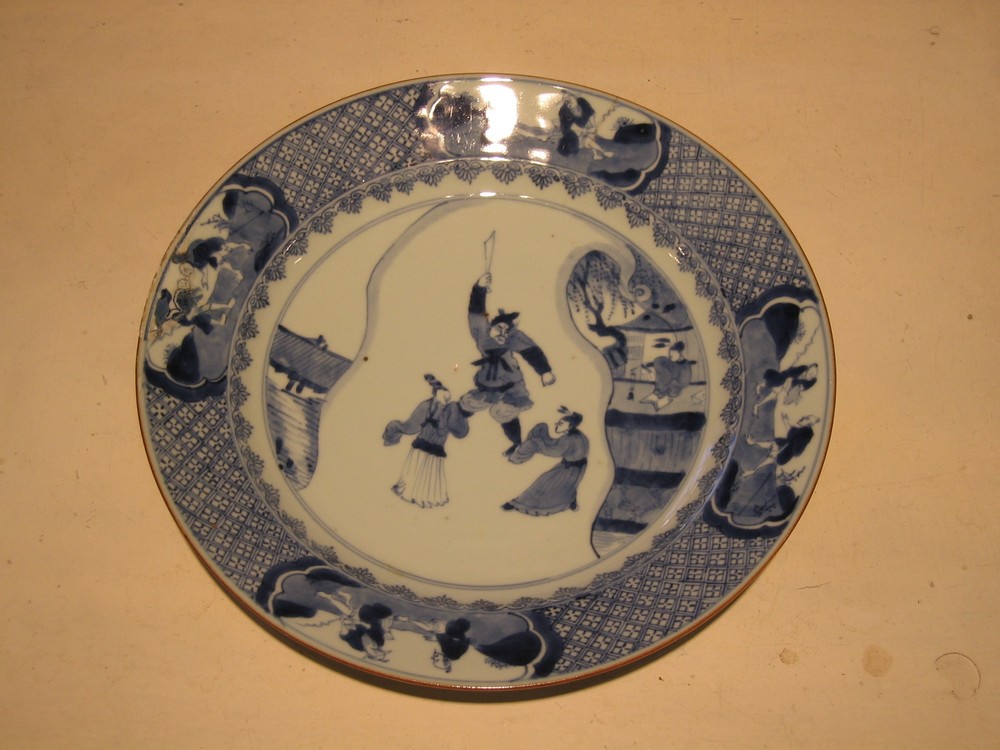 Porseleinen bord met houten standaard in blauw en wi...
