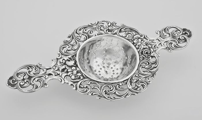 Zilveren theezeef met platte oren