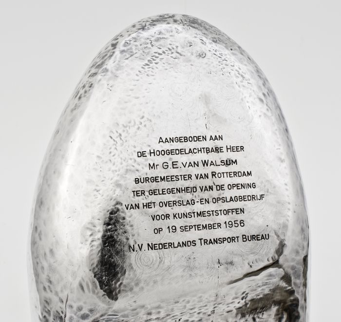Zilveren klomp met "Aangeboden aan / de Hoogedelacht...