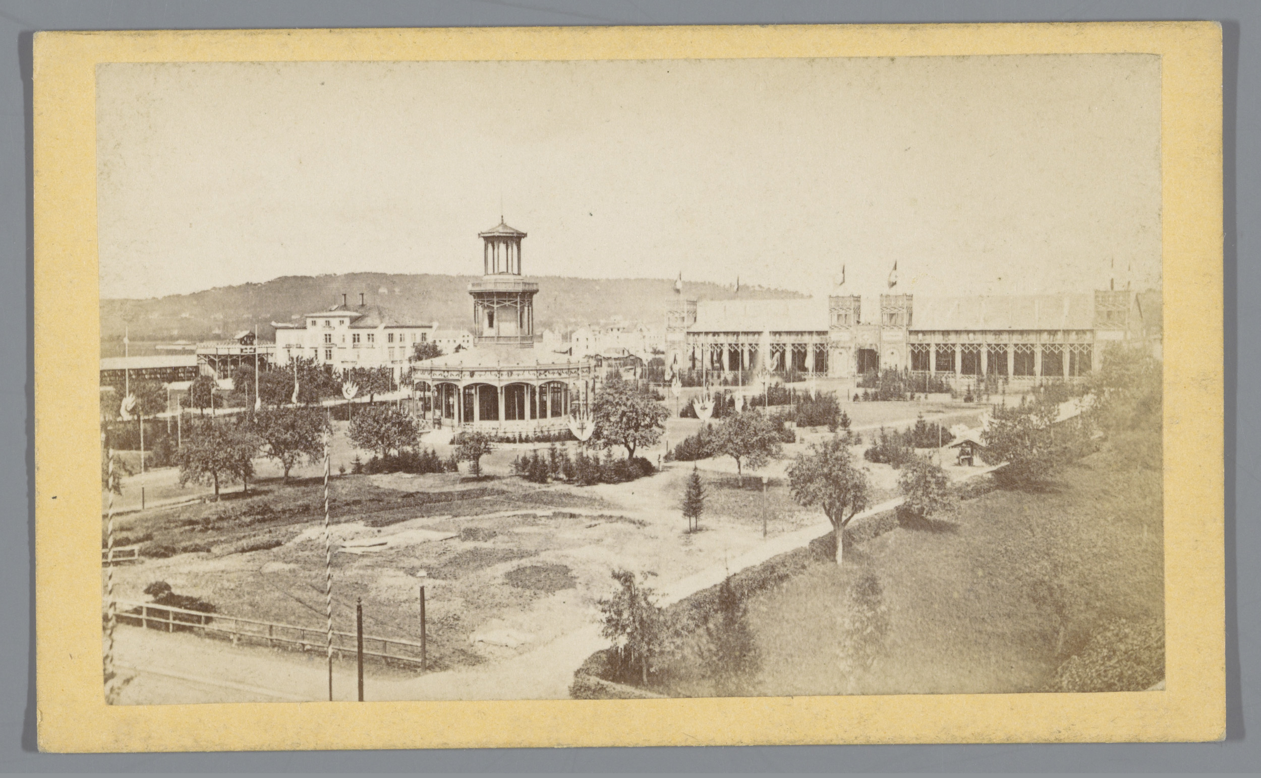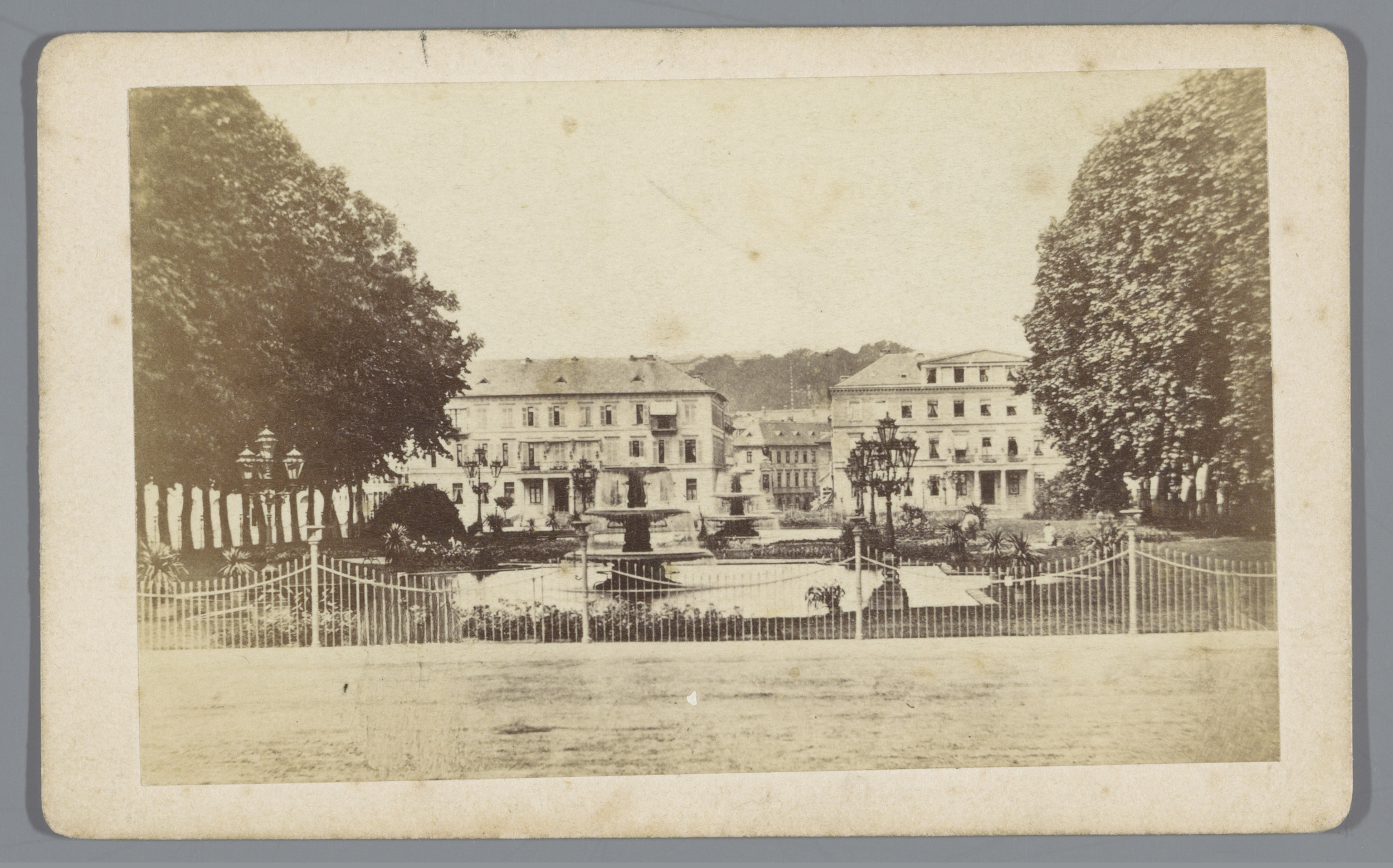 Park met lantaarns en fonteinen achter hekwerk, in d...