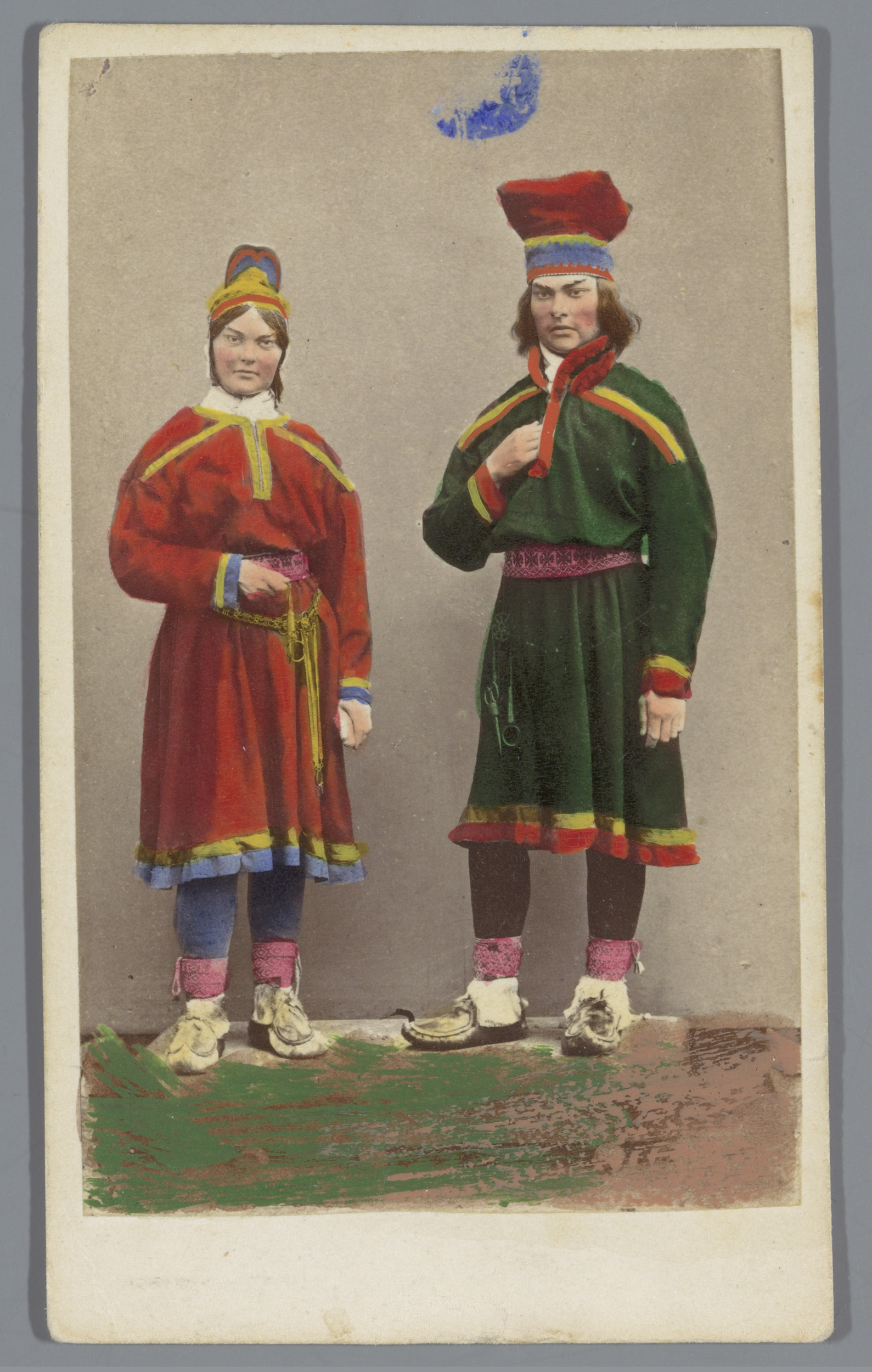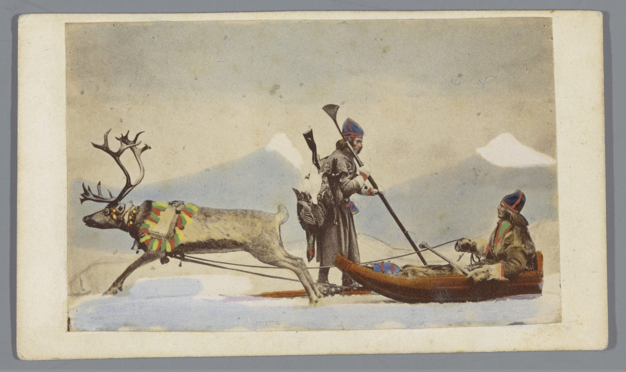 Twee mannen met rendierslee in klederdracht uit Åsel...
