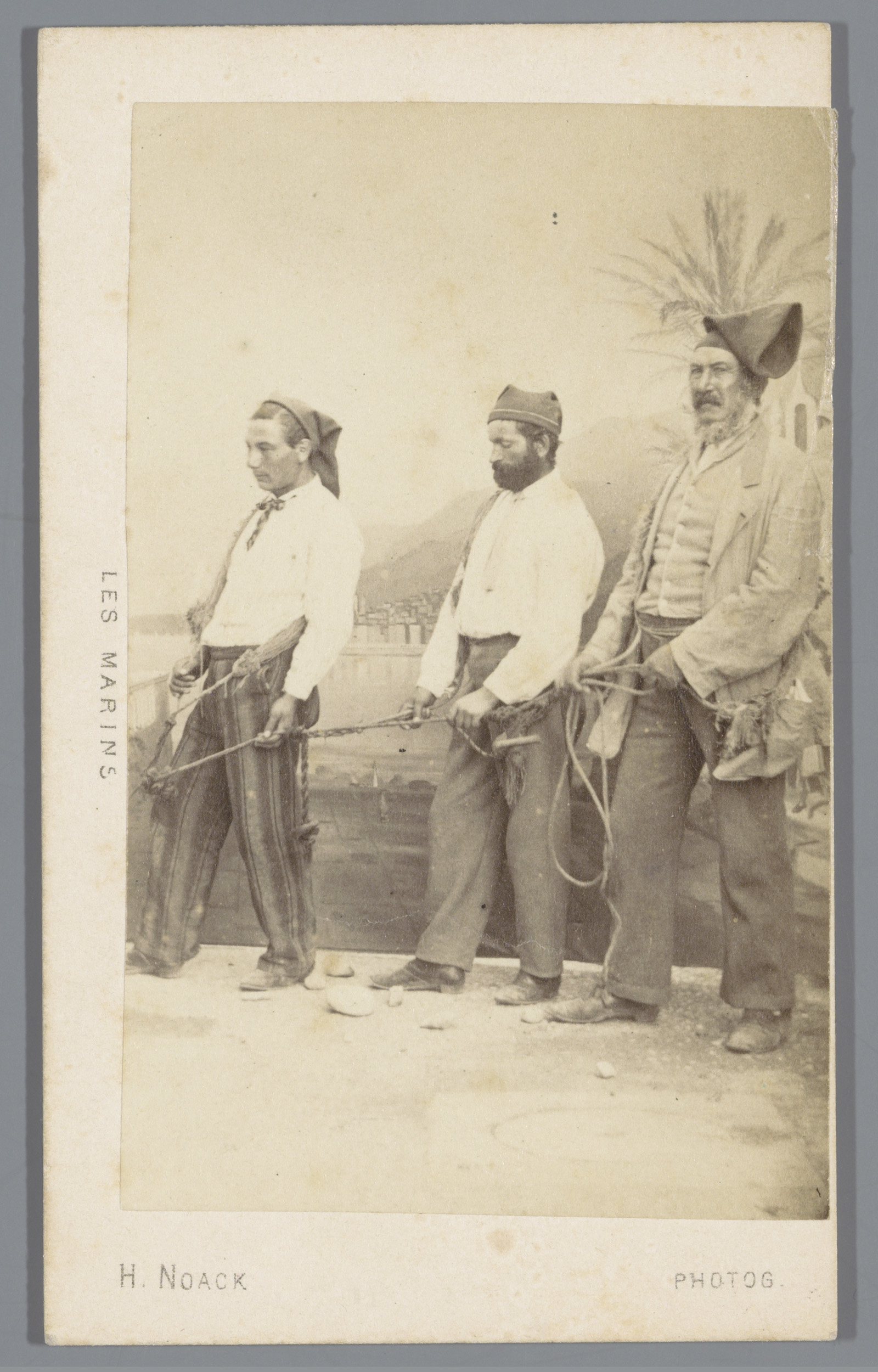 Portret van drie onbekende zeelieden aan een kade in...