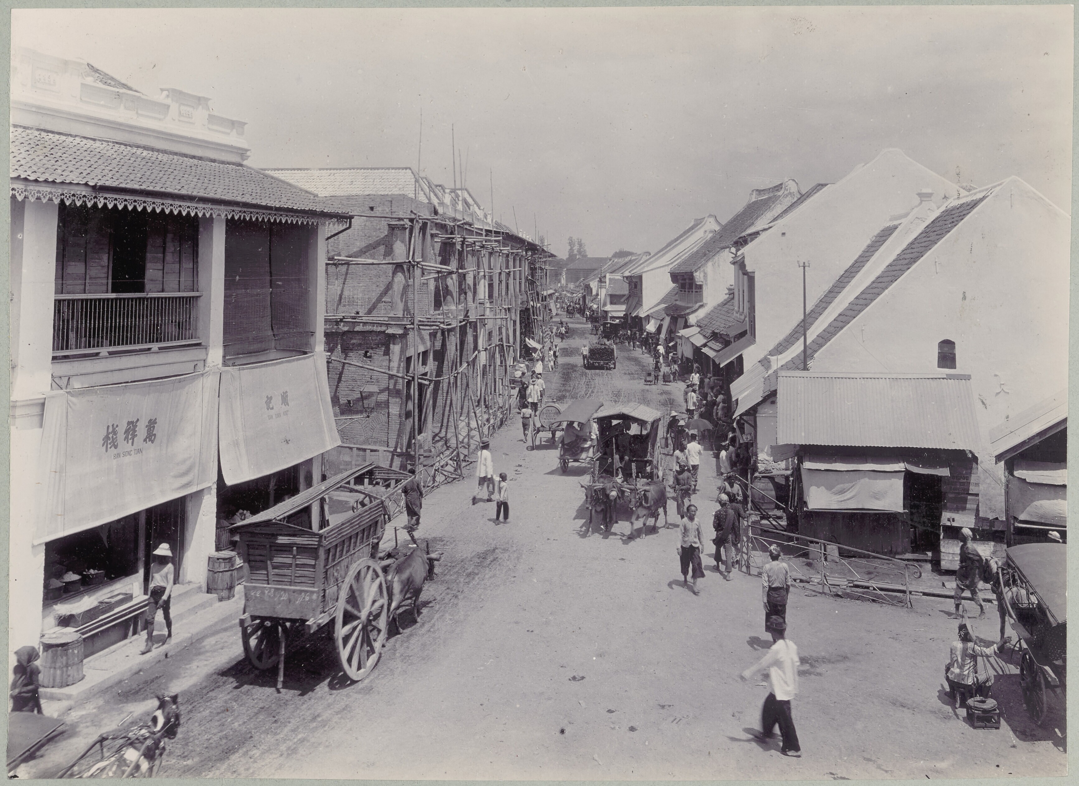 Straatgezicht met links een Chinese pagode te Soerabaja