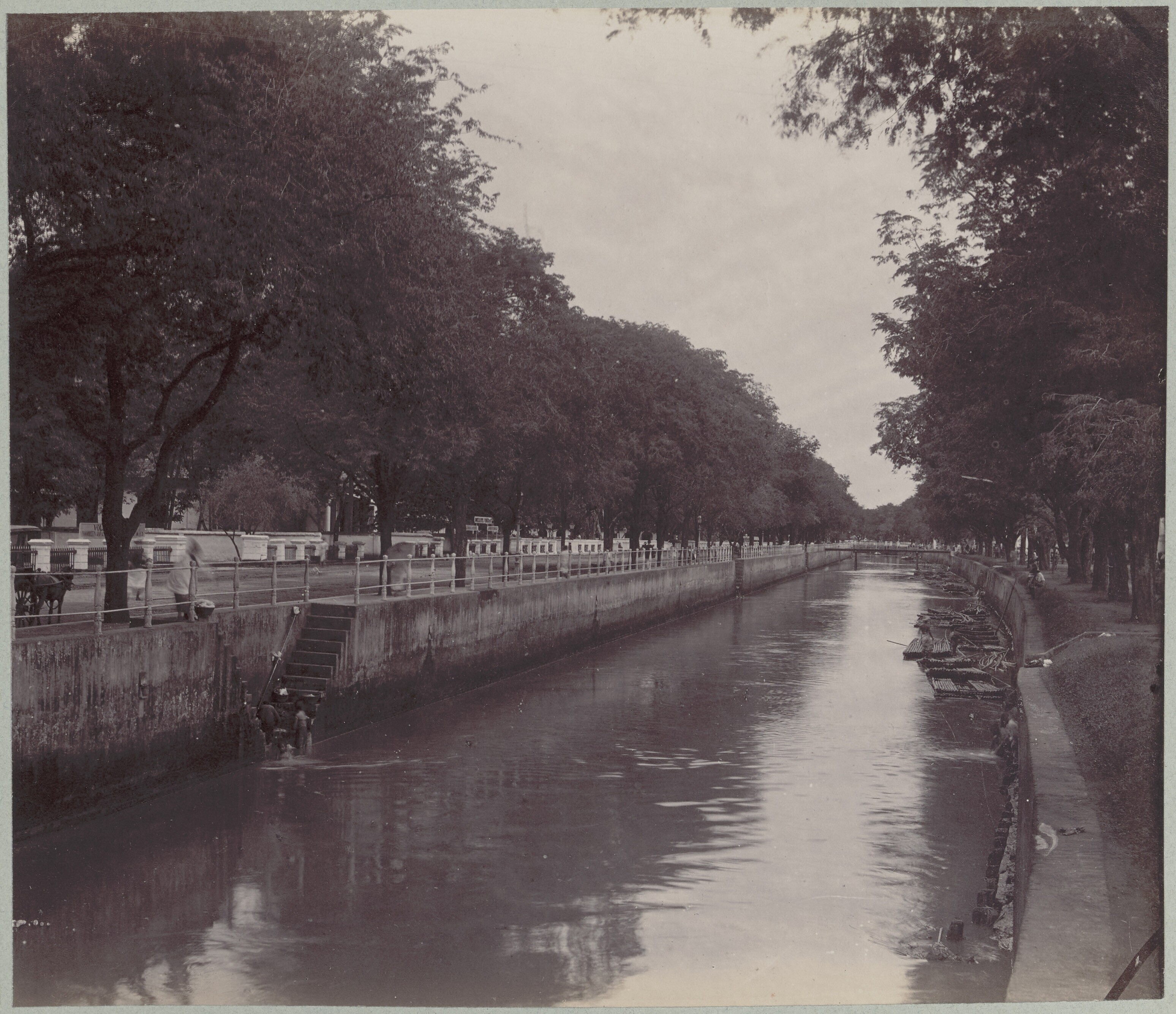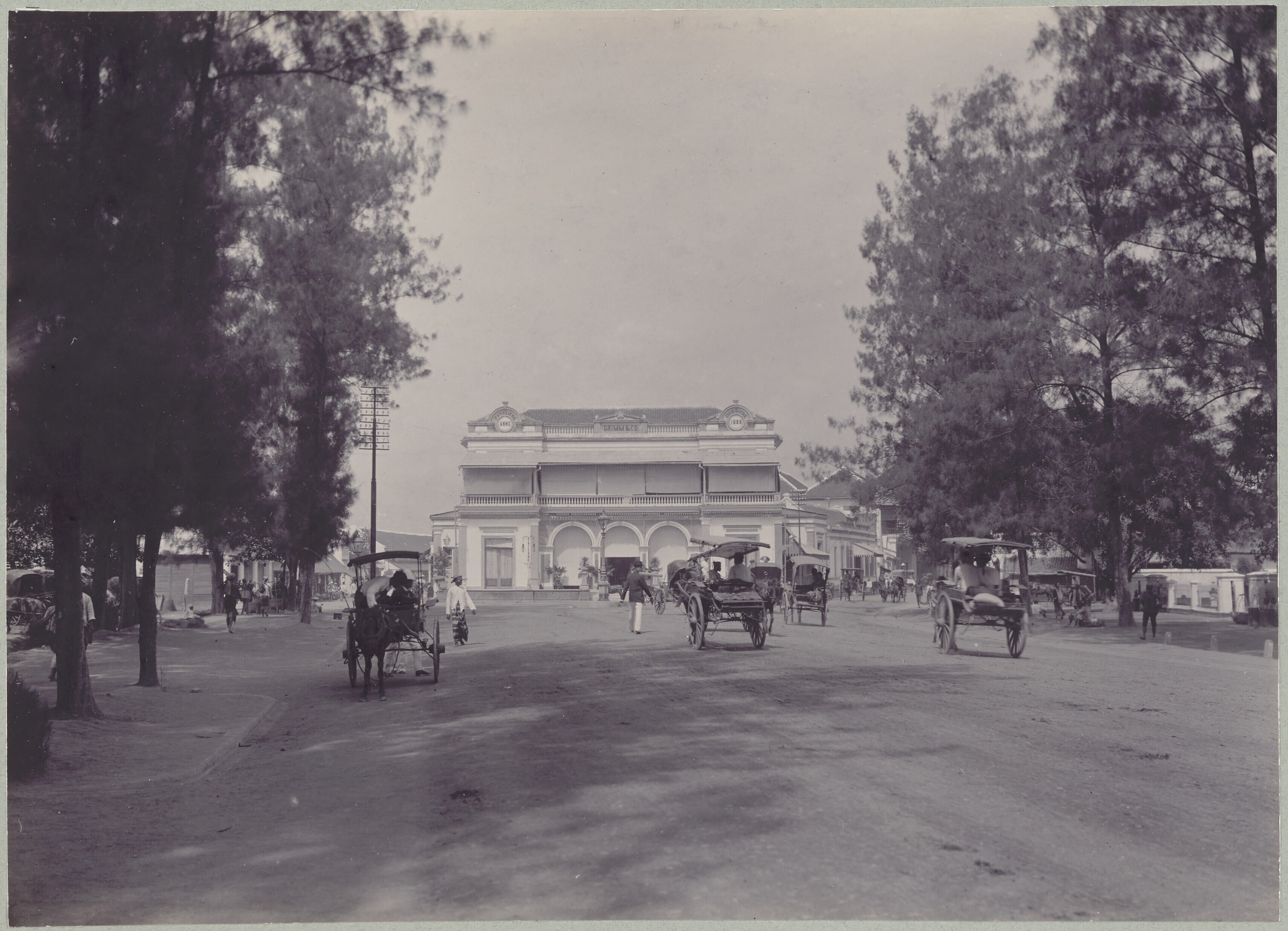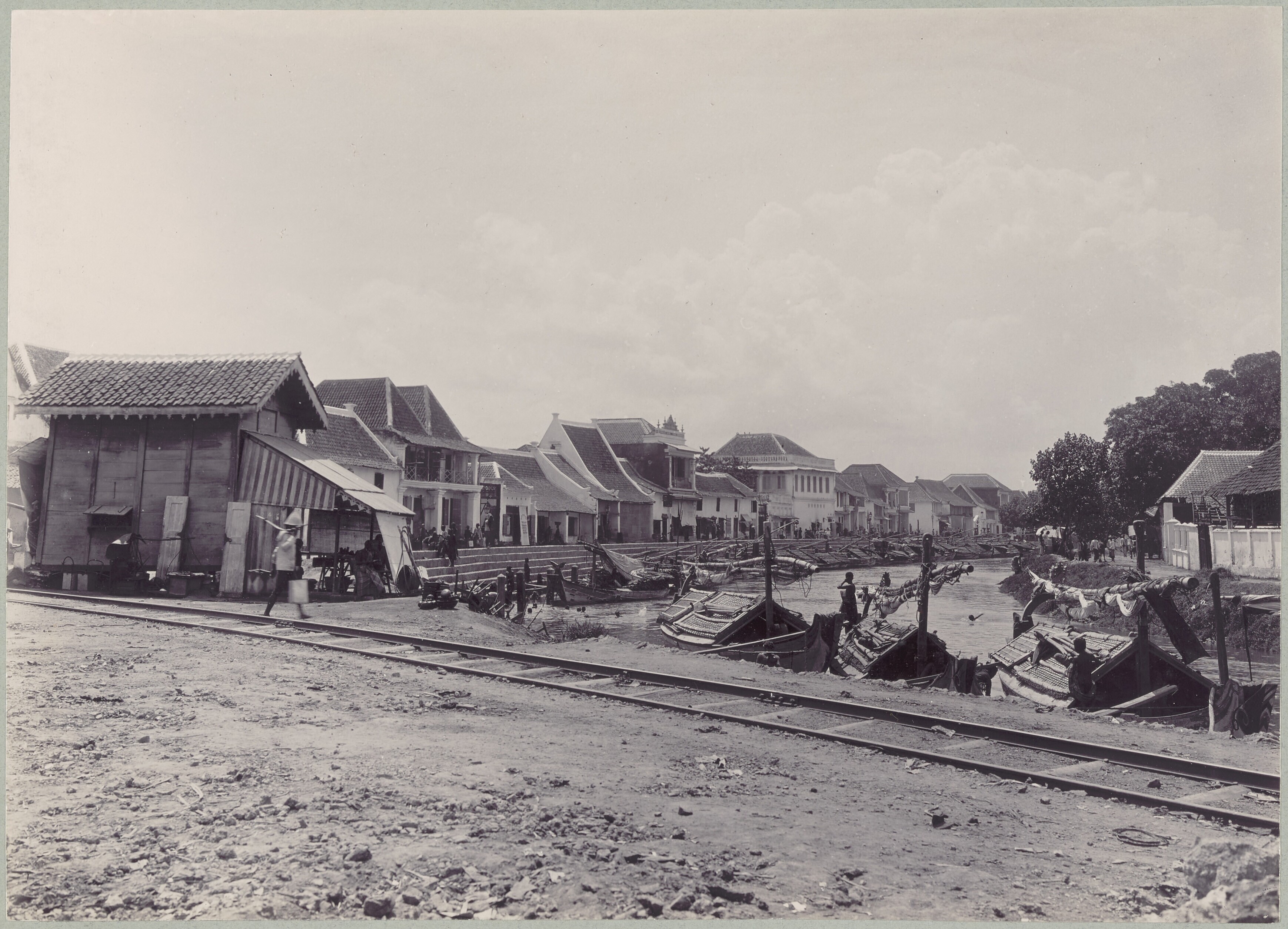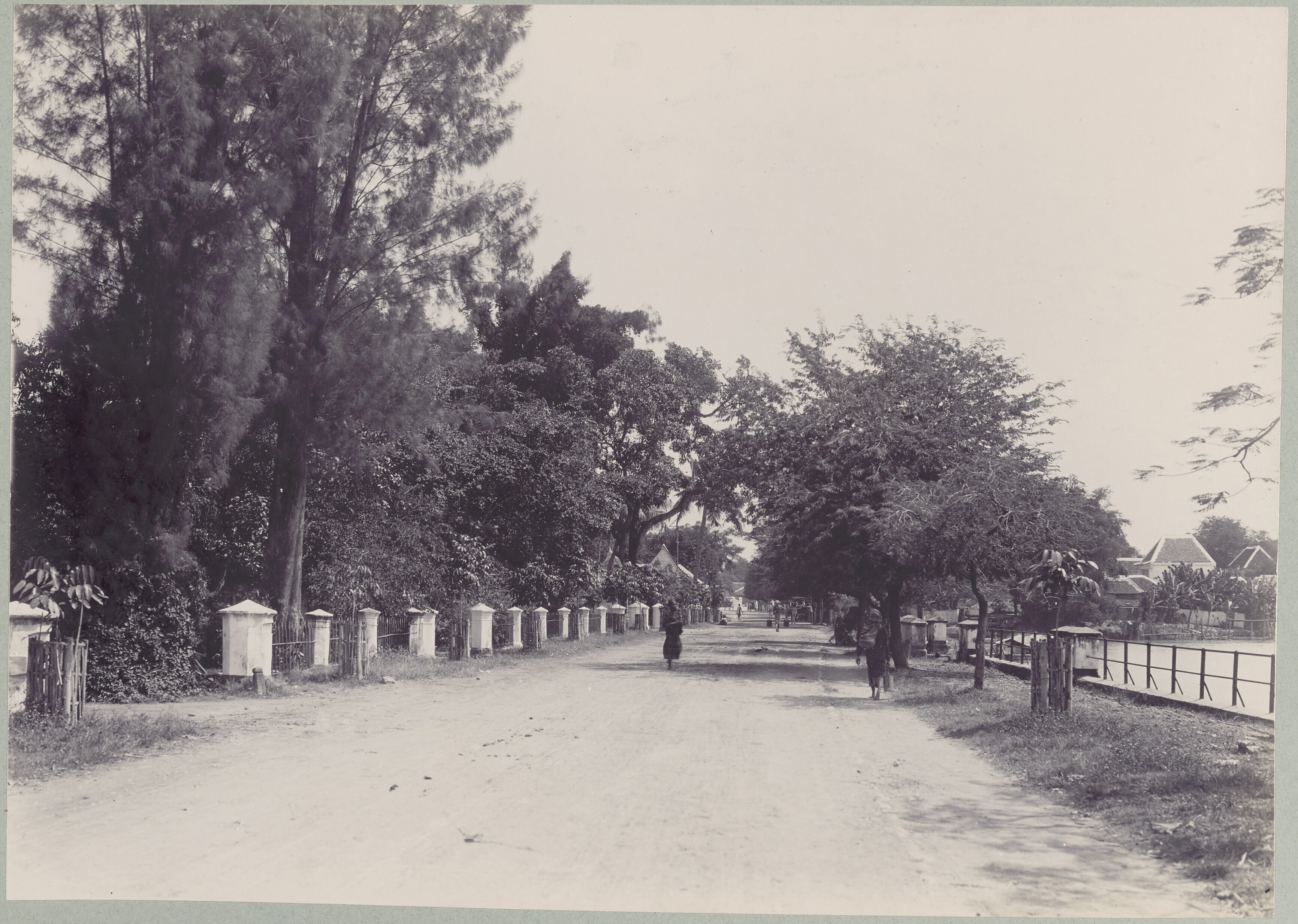 Gezicht op een straat in Soerabaja met een stoomtram...