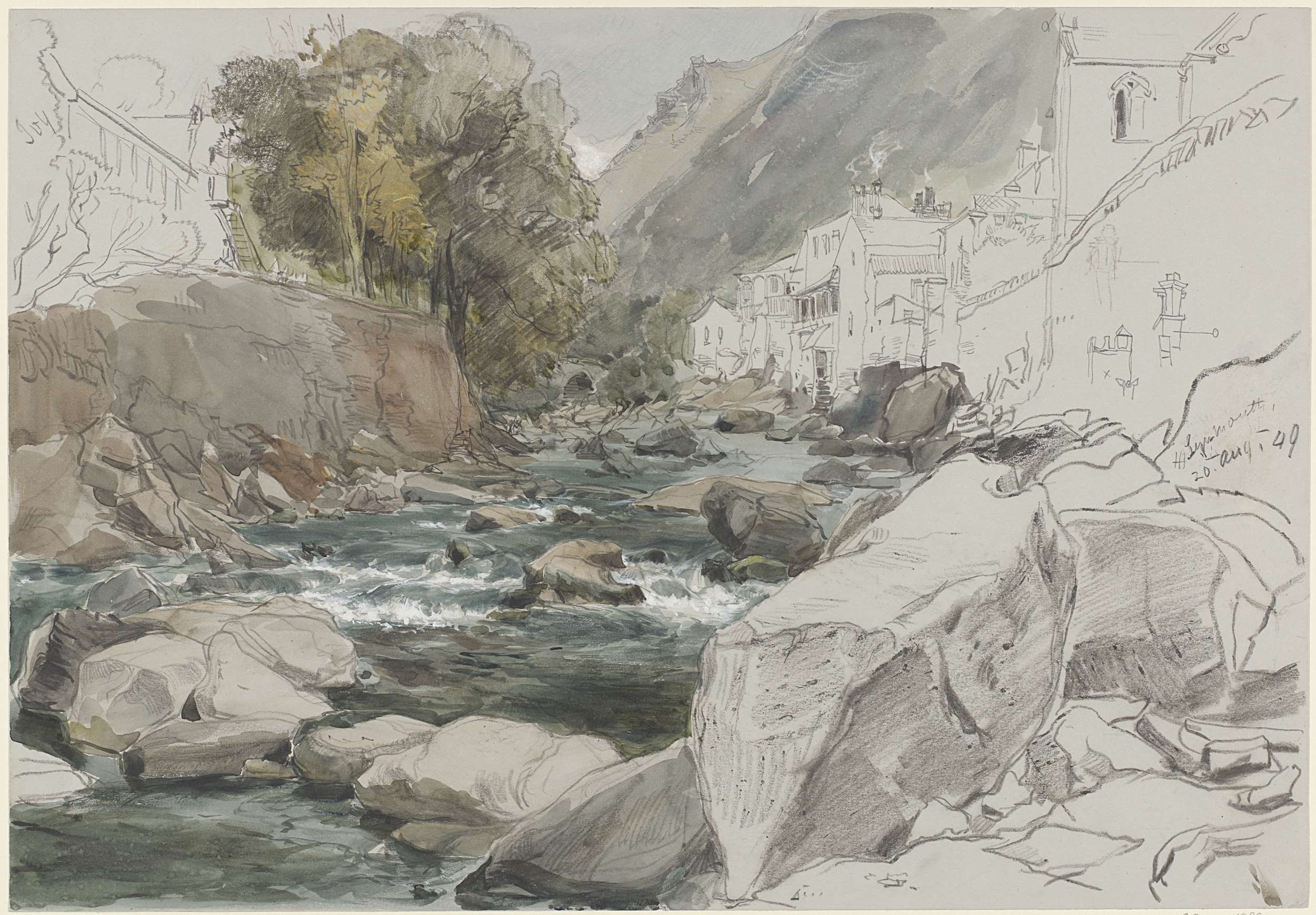 Rivier met schepen bij een bebouwde oever