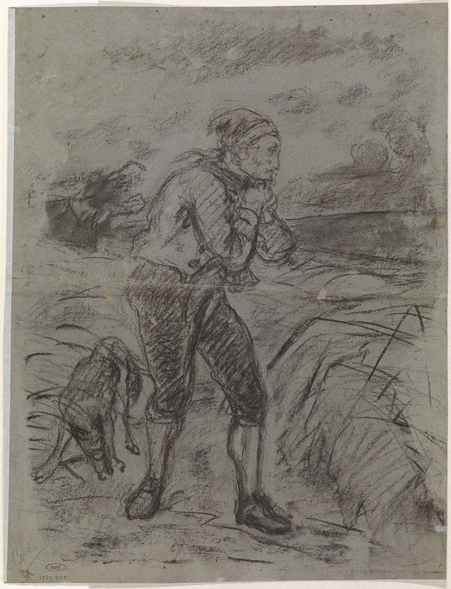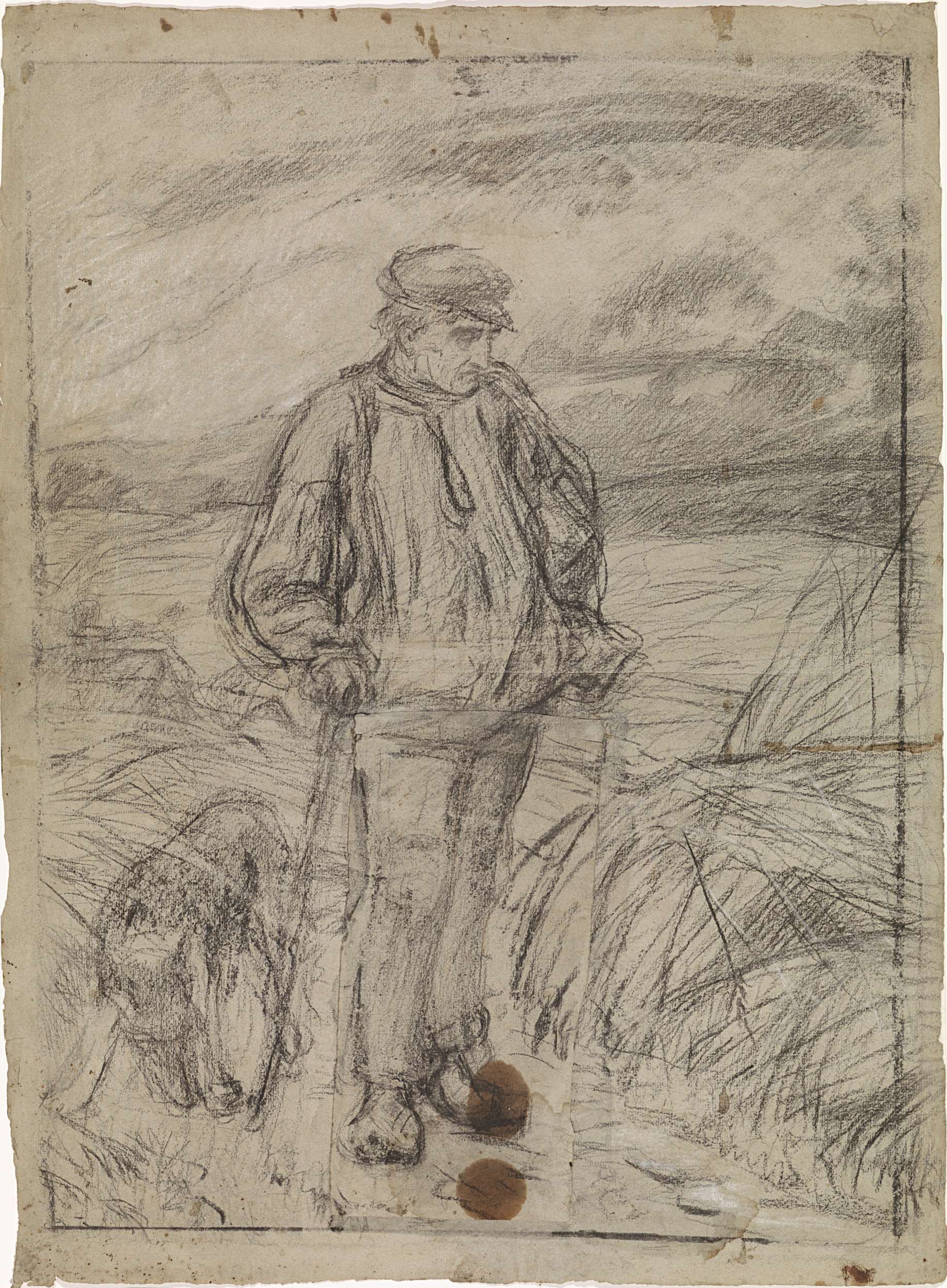 Staande boer en zijn hond op de akker, de benen nogm...