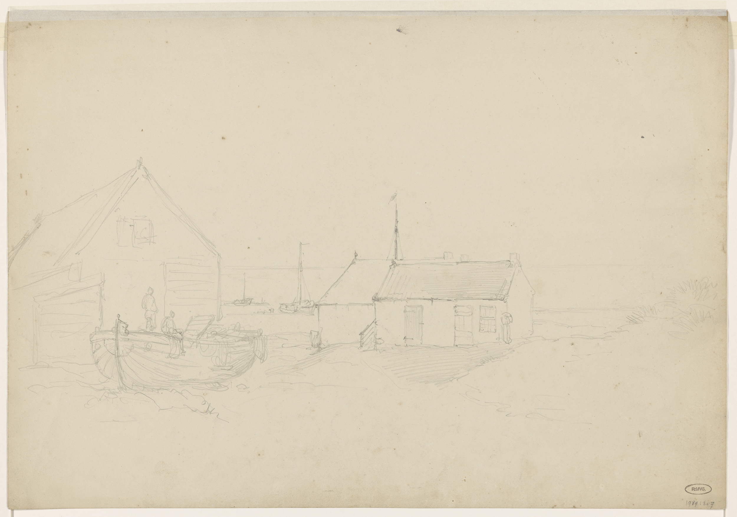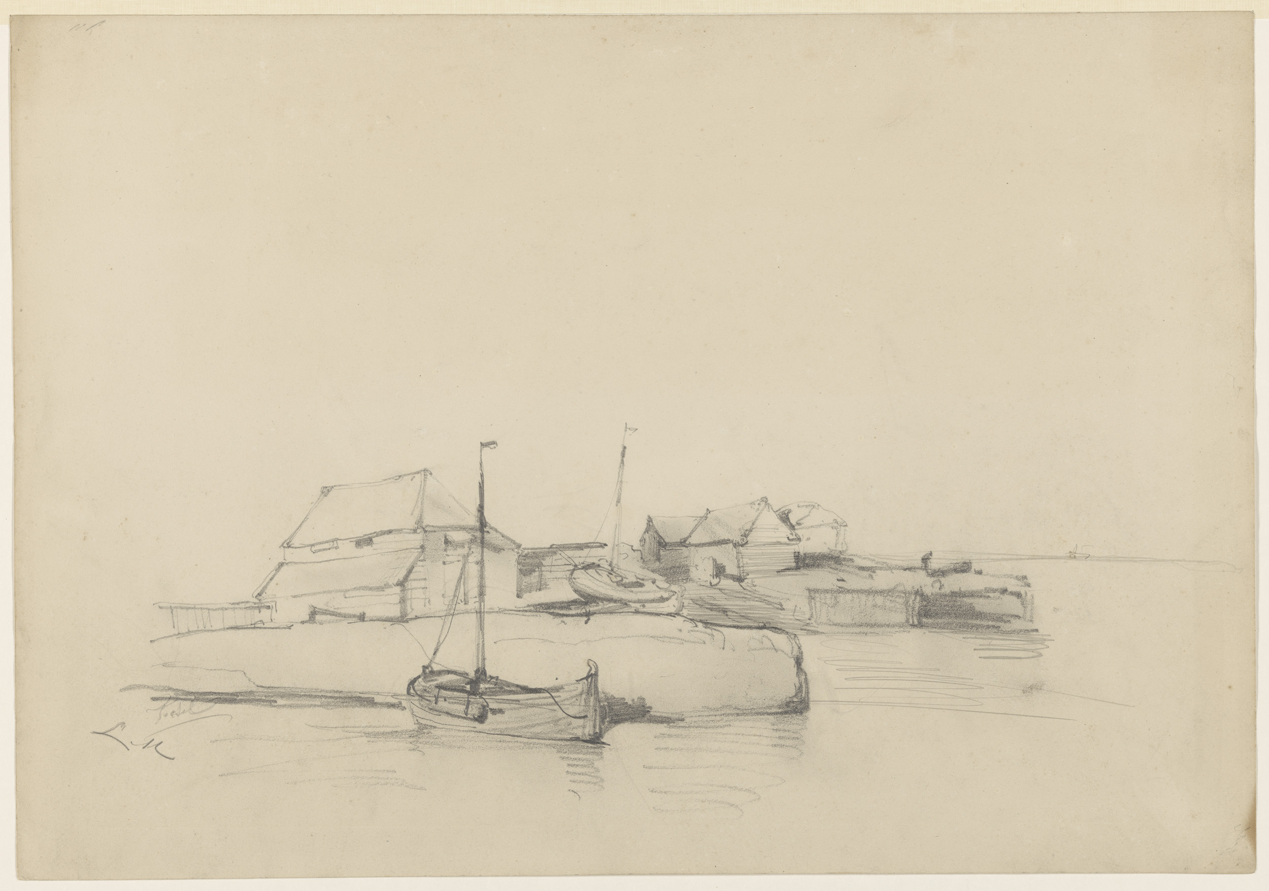 Huizen en twee schepen bij de kust