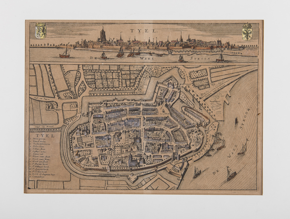 Gravure, voorstellende gezicht op Tiel vanaf de Waal...